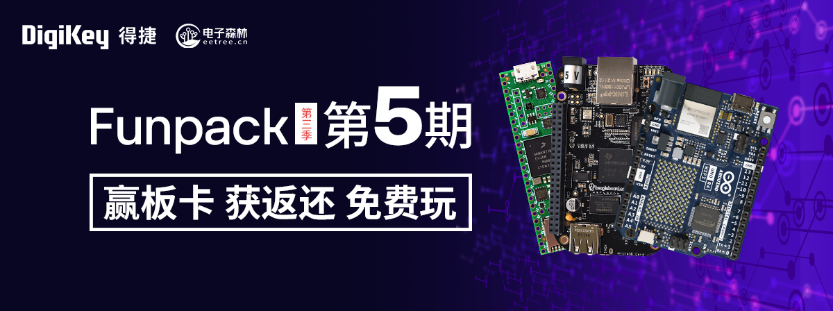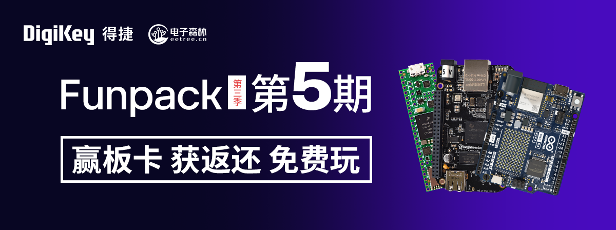 Funpack活动是硬禾学堂联合DigiKey发起的“玩成功就全额退”活动。目前第三季正在进行中,本季共5期,每期我们都会推出一款或多款全球顶级半导体厂商的开发板/仪器套件。参与者需先从“得捷购”购买规定板卡,并在规定时间内完成指定任务,就可以获得购板返还,项目优秀者另有额外奖励。