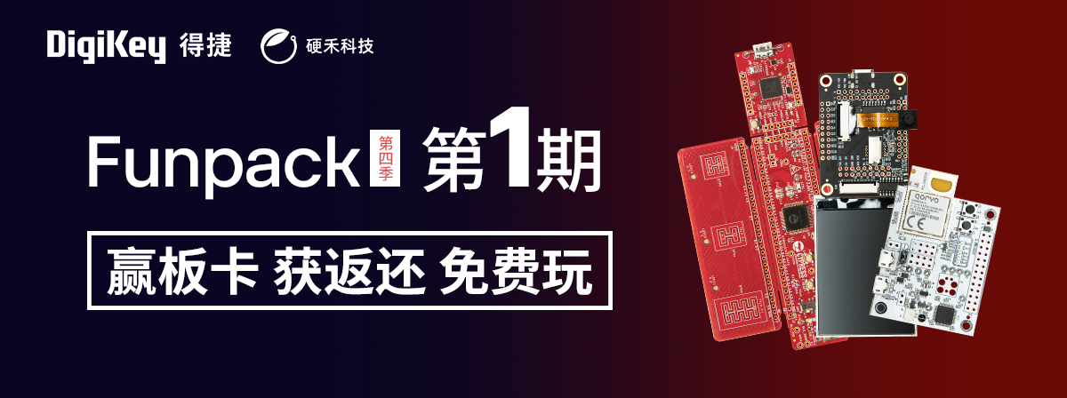 Funpack活动是硬禾学堂联合DigiKey发起的“玩成功就全额退”活动。前三季活动已圆满结束,现在迎来第四季,本季共3期。每期活动我们会推出多款全球顶级半导体厂商的开发板/仪器套件,参与者可从中任选一款并通过指定“得捷购”购买板卡,并在规定时间内完成指定任务,就可以获得购板返还,项目优秀者另有额外奖励。