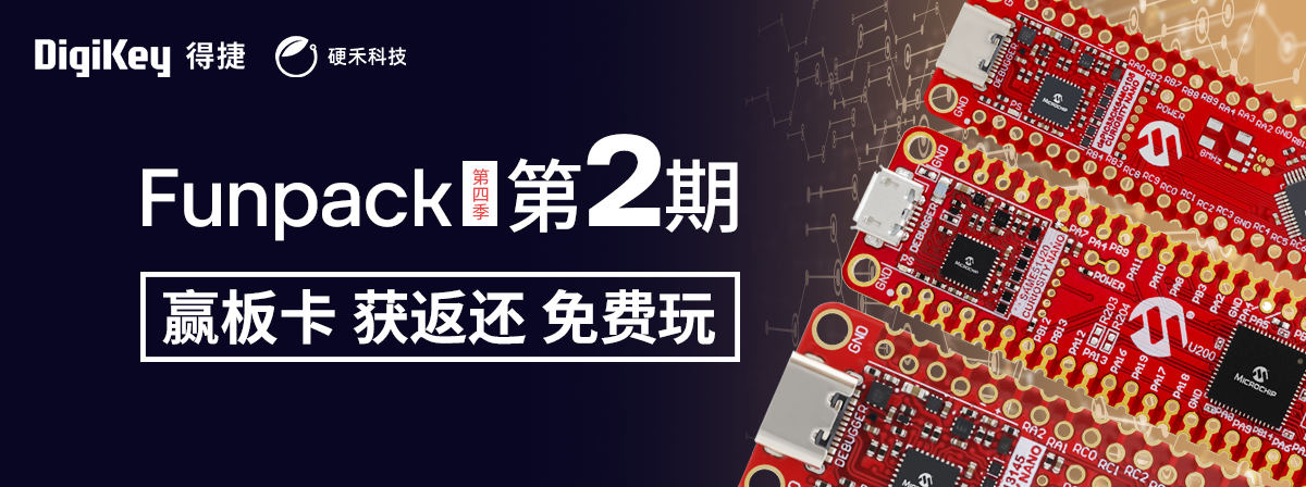 Funpack活动是硬禾学堂联合DigiKey发起的“玩成功就全额退”活动。前三季活动已圆满结束,现在迎来第四季,本季共3期。每期活动我们会推出多款全球顶级半导体厂商的开发板/仪器套件,参与者可从中任选一款并通过指定“得捷购”购买板卡,并在规定时间内完成指定任务,就可以获得购板返还,项目优秀者另有额外奖励。