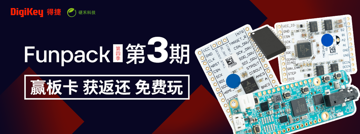 Funpack活动是硬禾学堂联合DigiKey发起的“玩成功就全额退”活动。前三季活动已圆满结束,现在迎来第四季,本季共3期。每期活动我们会推出多款全球顶级半导体厂商的开发板/仪器套件,参与者可从中任选一款并通过指定“得捷购”购买板卡,并在规定时间内完成指定任务,就可以获得购板返还,项目优秀者另有额外奖励。