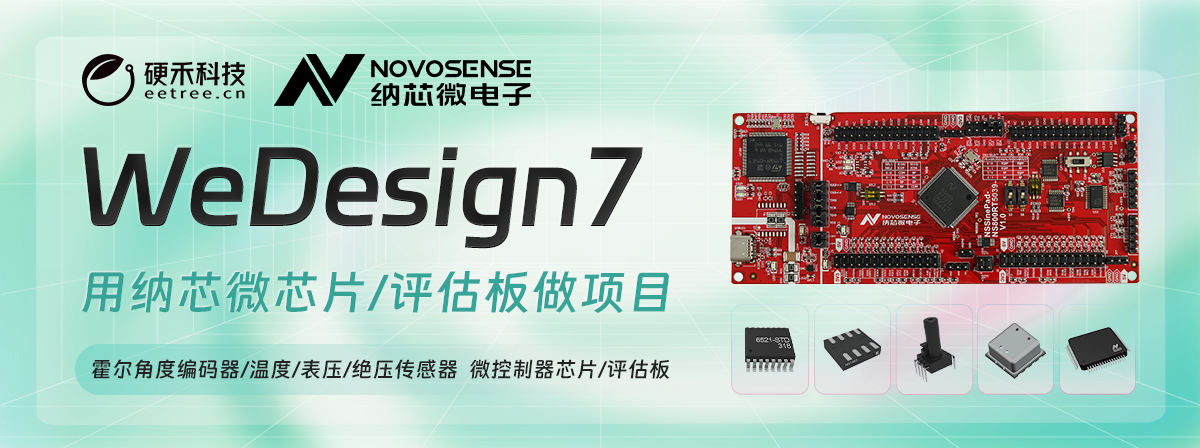 本期活动的产品由纳芯微提供,包含4款传感器芯片:霍尔角度编码器MT6521、温度传感器 NST461-DQNR、表压传感器 NSPGD1M006DT04、绝压传感器 NSPAD1N200DR04;1款微控制器芯片NS800RT5039;1款评估板 NSSinePad-NS800RT5039。另外硬禾还提供1款测量仪器:带屏12指神探。参赛者需根据具体的任务选择传感器芯片/微控制器芯片/评估板下单购买,并根据所选产品进行PCB设计,打板,焊接,完成项目,最后提交项目报告。(注:选用评估板的项目可省略PCB设计部分)