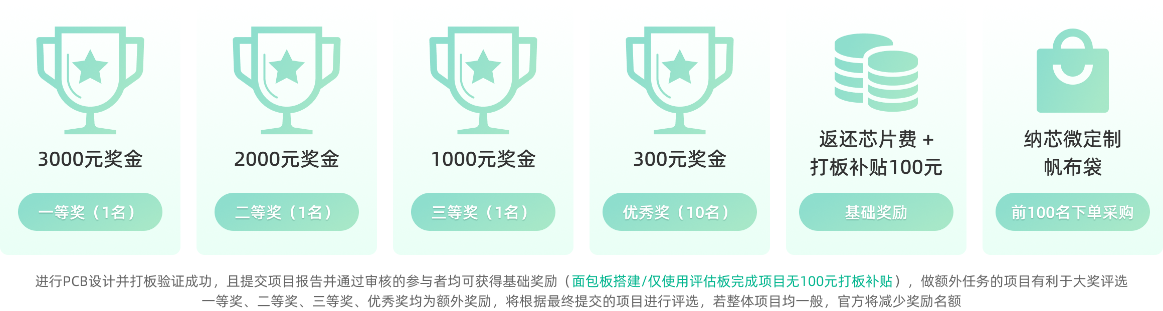 参赛者提交项目并通过审核均可获得基础奖励(返还芯片采购费用+100元打板补贴)并进入大奖评选,做额外任务的项目获大奖的机率更高,额外大奖设置一等奖(1名)、二等奖(1名)、三等奖(1名)、优秀奖(10名)。另外,前100名参赛购买器件的小伙伴均可获得纳芯微定制帆布袋1个。