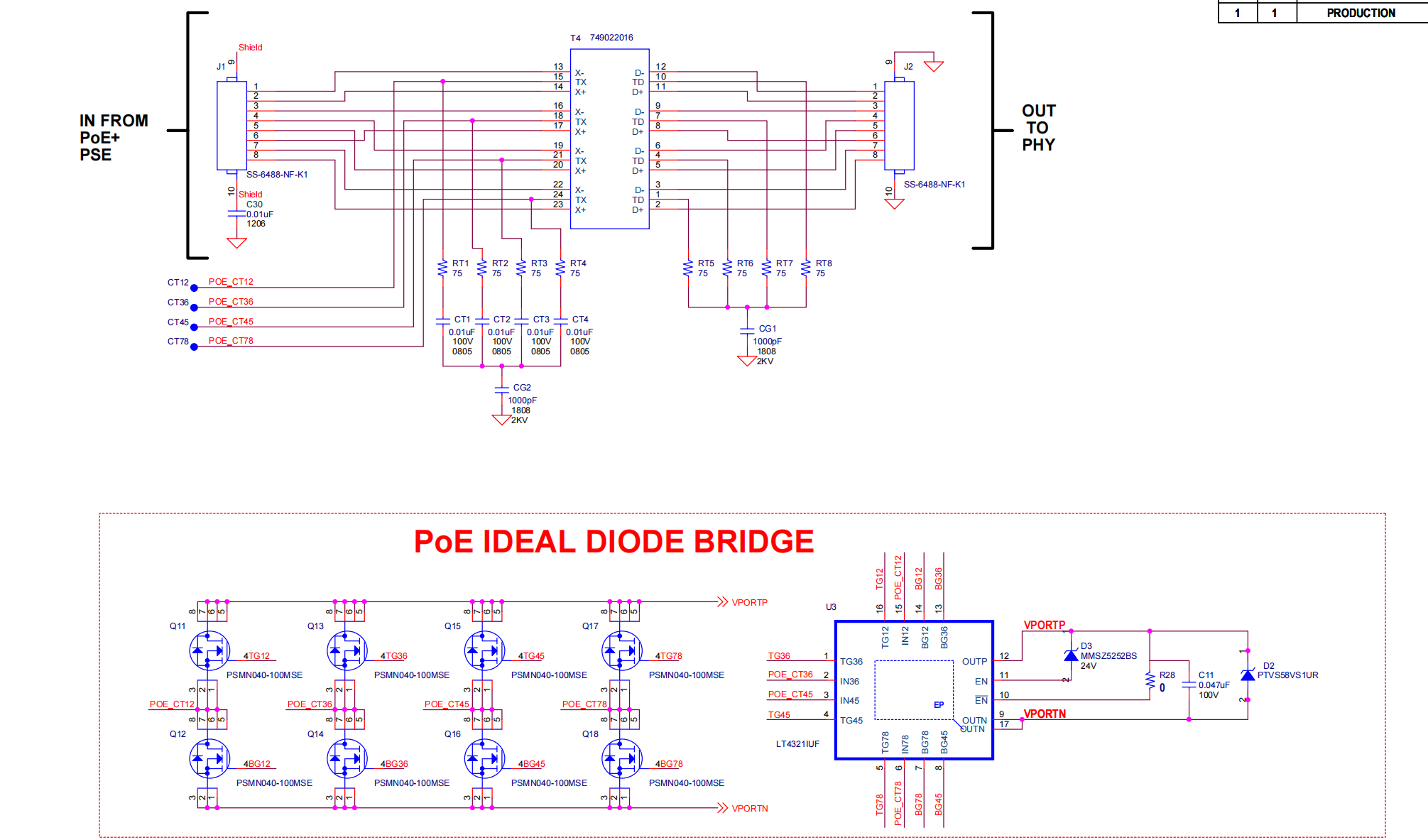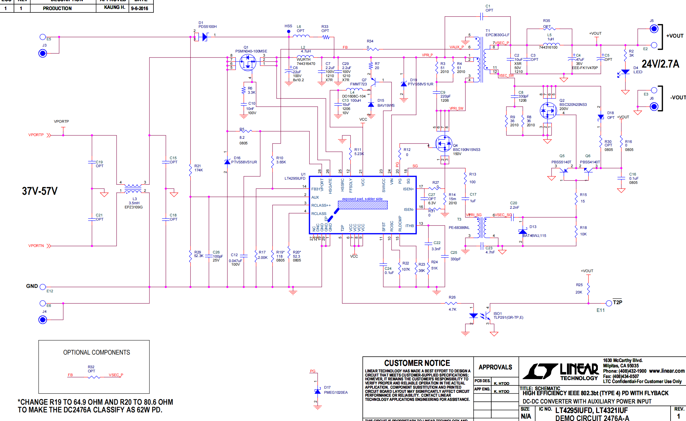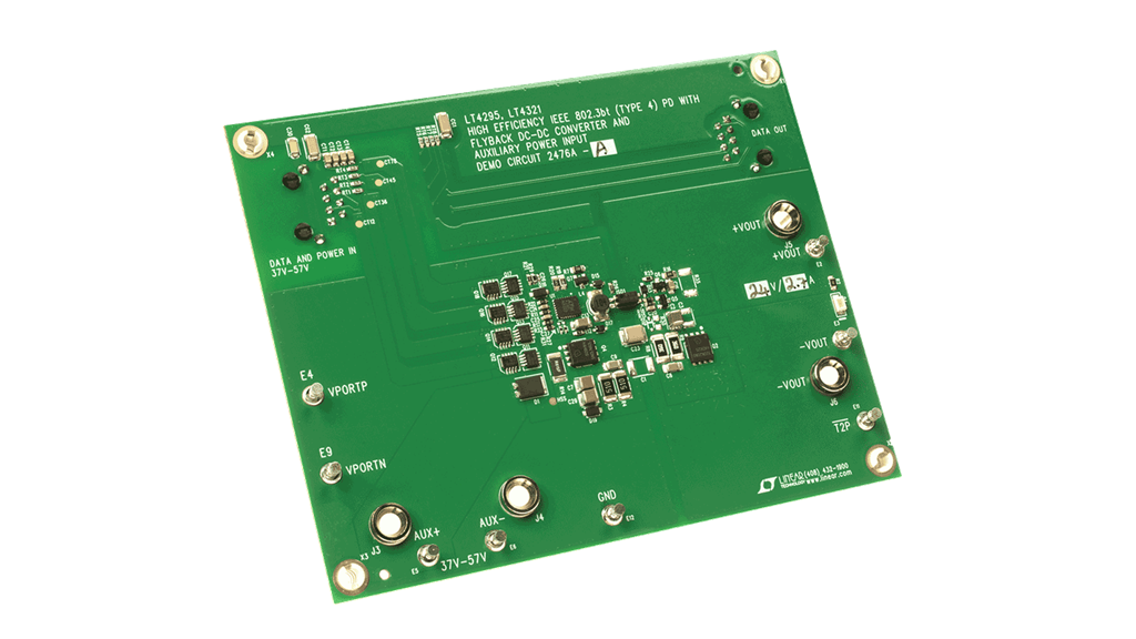演示电路2476A是一款经过以太网Alliance™第二代PoE认证的IEEE 802.3bt兼容型以太网供电(PoE)受电设备(PD)。它内置LT4295 PD接口和开关稳压器控制器以及LT4321 PoE理想二极管电桥控制器。 LT4295提供IEEE 802.3af(PoE、1类)、IEEE 802.3at(PoE+、2类)和IEEE 802.3bt(PoE++、3类和4类)兼容接口和电源控制。它利用外部低RDS(on)(30mΩ典型值)N通道FET实现热插拔功能以提高效率。LT4295可控制利用高效率反激式同步整流拓扑的DC/DC转换器。 LT4321控制八个低RDS(on)(30mΩ典型值)N通道FET以便进一步提高端到端功率传输效率并简化散热设计。该解决方案取代了无源PoE整流器电桥中常见的八个二极管。 DC2476A-A使用辅助电源输入通过RJ45连接器(J1)或本地48V DC电源接受来自供电设备(PSE)高达71.3W的传输功率。连接两种电源时,辅助电源输入优先于PoE输入。DC2476A-A在电流分别高达2.7A和2.4A时提供24V输出作为8类(71.3W) PD和7类(62W) PD应用。