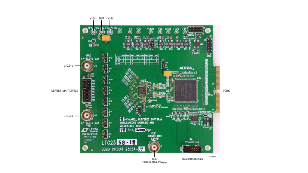 演示电路2365A突出展示了LTC2358系列的缓冲输入模数转换器(ADC)。LTC2358、LTC2357、LTC2353和LTC2333是低噪声、高速的16位/18位逐次逼近寄存器(SAR)ADC,并且集成了前端缓冲器。这些ADC接受广泛的共模范围。皮安级输入和高共模抑制比(CMRR)使这些ADC能够直接连接到广泛的传感器范围,而不会损害测量精度。以下文本指的是LTC2358-18,但适用于该系列的所有部件,唯一的区别在于位数、通道数量和最大采样率。LTC2358-18具有灵活的SoftSpan™接口,允许逐次转换控制每个通道的输入电压范围。内部2.048V的参考源和2X缓冲器简化了基本操作,而外部参考源的使用可以增加输入范围并提高ADC的信噪比(SNR)。