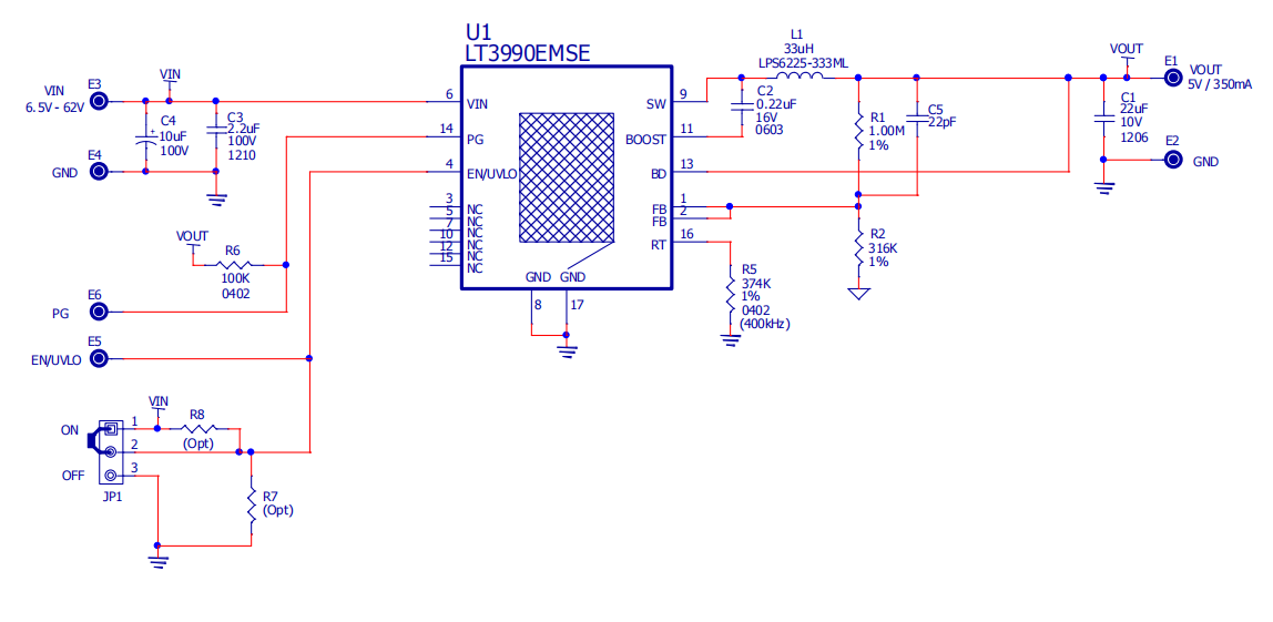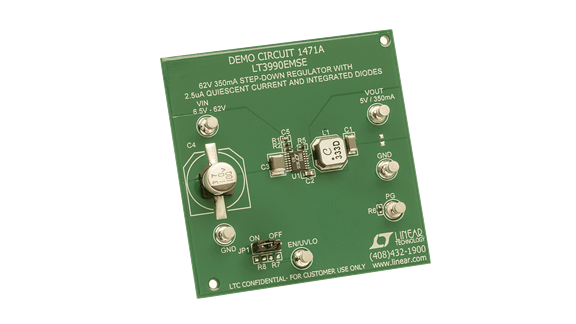 演示电路1471是一个采用LT3990的单片降压DC/DC开关调节器。它能够将6.5V至62V的输入电压转换为5V、350mA的输出,适用于多种输入源,如汽车电池和24V工业电源。LT3990的宽输入电压范围和可调至2.2MHz的开关频率提供了设计上的灵活性。在轻负载条件下,低纹波Burst模式能够提高能效,同时保持输出纹波在5mV以下。该芯片在EN引脚接收到高电平时工作,低电平时关闭,且在VIN超过4.2V时EN引脚的阈值为1V。通过在VIN和EN引脚之间添加电阻分压器,可以设定LT3990仅在VIN达到预设电压以上时调节输出。集成的续流二极管和升压二极管减少了组件数量并缩小了解决方案的尺寸,整个电路的静态电流仅为2.5μA,具有快速瞬态响应和良好的环路稳定性。