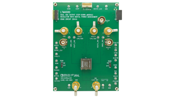 DC2844A 演示板是一款高效率、高密度的双输出 µModule® 稳压器评估板,设计用于 4.5V 至 16V 的输入电压范围,并能够为每个输出提供最高 30A 的负载电流。该板搭载了 LTM4680 µModule 稳压器,这是一款具备数字电源系统管理功能的器件,能够作为双 30A 输出或单 60A 输出的降压型稳压器。为了简化评估过程,DC2844A 在上电时会自动设置为默认配置,并利用配置电阻器生成所需的功率,无需串行总线通信。若要充分利用 LTM4680 的高级电源管理功能,用户可以下载 LTpowerPlay® GUI 软件至 PC 并配合 ADI 的 DC1613A 接口转换板进行连接,实现对器件的实时配置和监控,包括电压、电流、温度和故障状态的遥测。