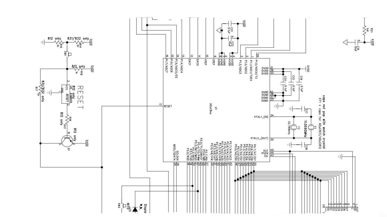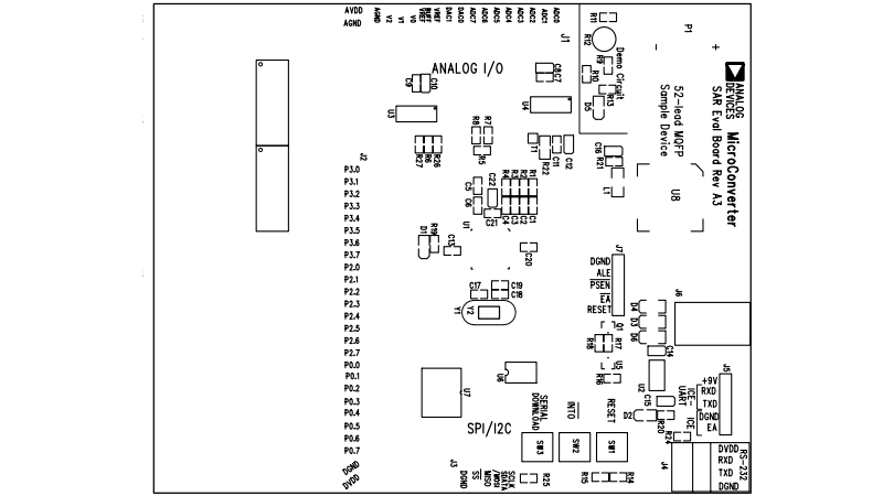 ADuC812是一款集成了8通道12位模数转换器(ADC)、双通道12位数模转换器(DAC)和8KB闪存的微控制器单元(MCU)。它属于MicroConverter®系列,并且有一个专用的评估板,该评估板配备了必要的接口和支持电路,以便于开发者评估和开发基于ADuC812的应用程序。评估板提供了丰富的接口,包括电源、复位、RS232串行通信以及SPI/I2C等通信接口。