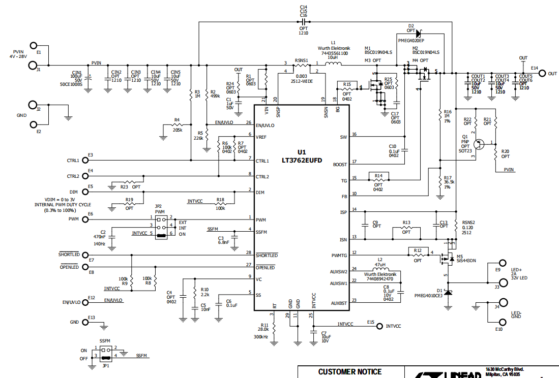 演示电路DC2342A是一款60V同步升压LED控制器,内置LT®3762。当VIN介于7V和28V之间时,可以驱动2A(最高32V)的1串LED。运行电压低至4VIN以降低ILED,同时可以耐受高达30V的VIN瞬态电流。DC2342A在约为300kHz的开关频率下运行。可通过简单的跳线开启扩频频率调制(SSFM),从而降低EMI。DC2342A设计用于在整个VIN范围内需要出色精度的高功率升压LED控制器应用。此演示电路提供对开路和短路LED条件的保护,每个条件具有其自己的标志。 LT3762具有2.5V至42V输入范围。它具有100kHz至1MHz的可调开关频率。使能SSFM使开关频率从fSW低至fSW– 30%,以降低EMI。可通过从LT3762的SSFM引脚至接地放置一个电容来设置SSFM速度,并通过将此引脚短接到GND来禁用。DC2342A具有简单的跳线选项,以使能/禁用扩频频率调制。 LT3762可以使用外部PWM信号以及内部生成的PWM信号进行PWM调光。LT3762的PWM至GND电容可设置PWM频率,同时PWM占空比由DIM端子上的电压确定。在0V至3V电压范围内,VDIM提供0.4%至97% PWM占空比。DC2342A有一个跳线,可设置为在内部生成的PWM信号、外部生成的PWM信号以及无PWM信号(100%开)之间切换。在PWM调光和扩频使能的情况下运行时,扩频本身可通过PWM信号对齐,以实现无闪烁操作。DC2342A也可通过在其两个CTRL转台的任一转台上放置一个电压源来进行模拟调光。 小型陶瓷输入和输出电容用于节省空间和成本。如果LED串开路,开路LED过压保护将使用IC的恒压调节环路将输出调节至35.5V左右,尽管它可能在由开路导致的瞬态期间几乎达到40V峰值。从LED+至GND存在一个保护二极管,以防在短路期间出现负振铃。 可通过几个简单的电阻选项调整电路上的欠压闭锁。可对DC2342A进行进一步修改,以便重新配置采用升压拓扑的电路,从而用作降压模式或升降压模式LED驱动器。详情请咨询工厂。 LT3762数据手册提供了该器件、操作原理和应用信息的完整描述。必须结合演示电路DC2342A的此演示手册阅读该数据手册。LT3762EUFD采用28引脚4mm × 5mm QFN塑料封装,具有散热增强型接地焊盘。为实现更大散热性能,适当设计电路板布局至关重要。