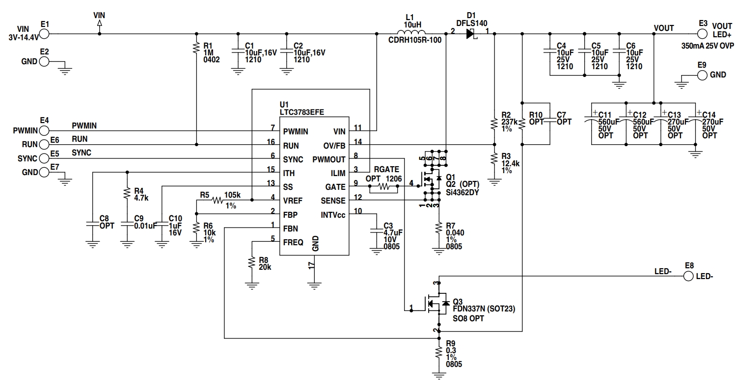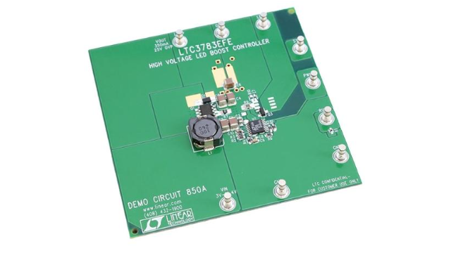 演示电路850A是一款高性能的升压LED驱动器,它采用了LTC3783EFE控制器,专为LED照明设计。这款控制器能够处理3V至14.4V的输入电压,并在高达25V的输出电压下提供高达360mA的LED电流。它具备输出过压保护功能,当LED串路意外断开时,能够将输出电压限制在27V以下,以防止损坏。此外,LTC3783还具有1000:1的PWM调光比,支持亮度控制和模拟调光功能。