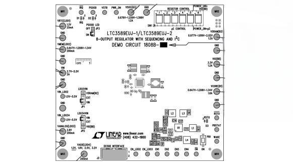 演示电路板1808B-A是一款输入电压范围为2.7V至5.5V的多输出电源供应电路,它配备了一个按钮控制器和I2C接口,并且采用了LTC3589EUJ-1 (-A)芯片。LTC3589EUJ-1芯片具备三个同步降压调节器(分别为1.6A、1.2A、1.2A),一个1.2A的升降压调节器,一个始终开启的25mA低压差线性稳压器(LDO),以及三个200mA的LDO调节器。通过I2C接口,可以控制这些开关调节器的设置,包括使能、反馈电压、工作模式以及其他功能。