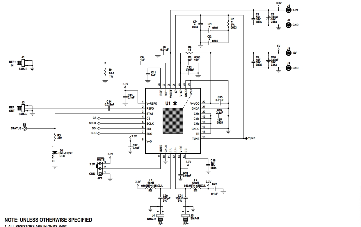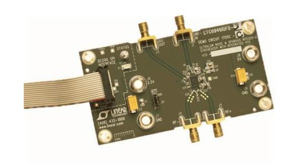 DC1705C 是一款采用 LTC6946 芯片的超低噪声和杂散整数 N 频率合成器参考设计。LTC6946 芯片具有集成化的 VCO,无需外部组件,且内部校准,无需外部系统支持。该电路板提供了四个不同的 LTC6946 版本选项,以满足不同的频率范围需求。电路板配备了 50Ω SMA 连接器,用于基准频率输入(REF+ IN)、基准输出(REF OUT)以及差分射频输出(RF+ 和 RF–)。通过 DC590 USB 串行控制器板和 SPI 通信,用户可以利用 PLLWizard™ 软件对 LTC6946 进行灵活控制。