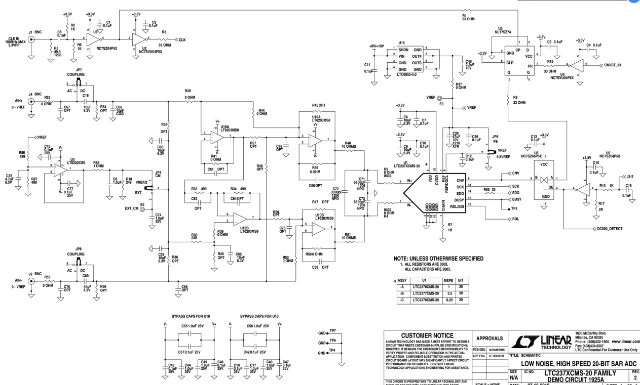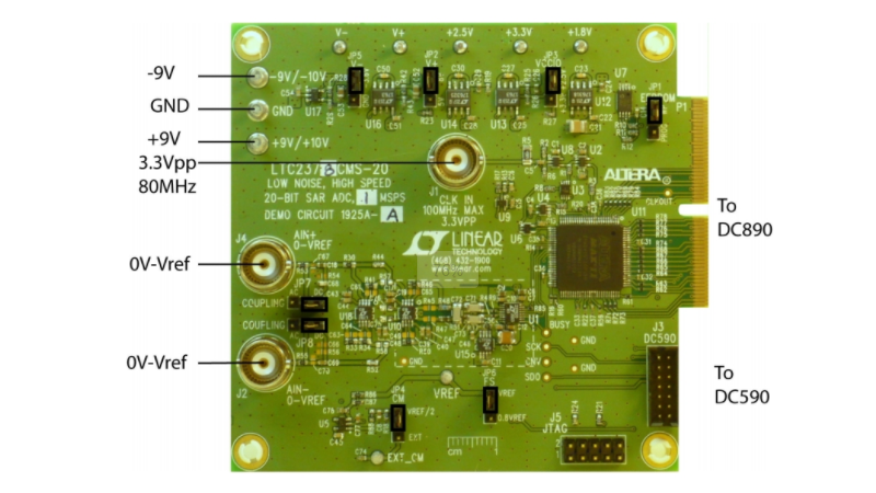 DC1925A是一款演示板,用于展示LTC2378-20、LTC2377-20和LTC2376-20这三款20位低功耗、低噪声、串行输出的SAR模数转换器(ADC)。这些ADC均由单一2.5V电源供电。虽然LTC2378-20的采样率最高,但所有型号之间的主要区别在于它们的最大采样率。LTC2378-20支持±5V的全差分输入范围,具有104dB的信噪比(SNR),功耗仅为21mW,并能在20位分辨率下达到±2ppm的最大积分非线性(INL),且无丢码。DC1925A演示板结合DC590 QuikEval™和DC890 PScope™数据采集板,展示了LTC2378-20的直流和交流性能。DC590用于演示直流性能,如峰峰值噪声和直流线性度。
