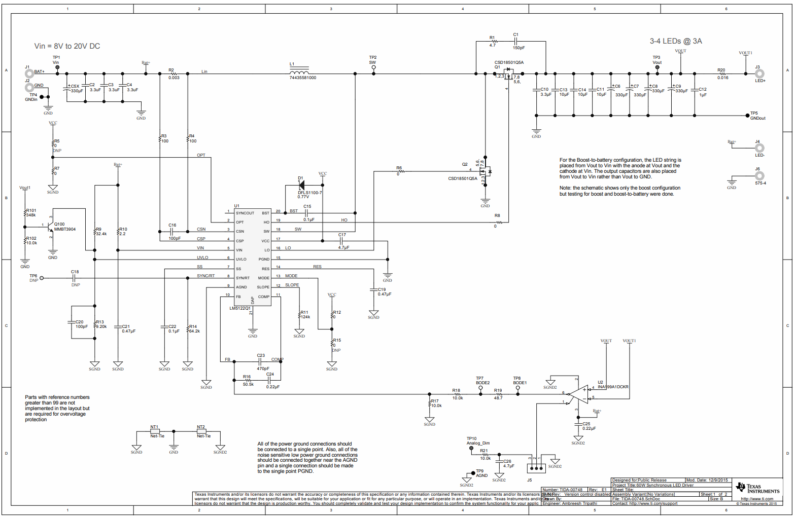 TIDA-00748 是利用同步升压转换器 LM5122-Q1 的适用于汽车 LED 应用的 60W 同步升压设计。此设计适用于汽车外部照明(例如头灯和尾灯)以及内部 LED 照明系统。此设计接受 8Vin 到 15Vin 的输入电压,并能以 3A 恒定电流驱动多个由 6 到 7 个 LED(16V 到 24V)串联而成的灯串。这是一种低成本解决方案,并提供欠压以及过压保护。与低效的非同步升压解决方案相比,此解决方案提供 97% 的效率。TIDA-00748 还可修改为“升压到电池”配置,方法是将 LED 灯串(9V 到 12V)的阴极连接到输入端而非接地端,并将输出电容器从输入端连接到输出端。在此配置中,8V 到 15V 输入可以对所需电压小于、高于或等于输入电压的 LED 灯串供电,这在标准升压配置中是不可行的,因为标准升压配置要求输出电压高于输入电压。请参阅图 1 以了解“升压到电池”配置以及 LM5122 的内部方框图。TIDA-00748 还可修改为“升压到电池”配置,方法是将 LED 灯串(9V 到 12V)的阴极连接到输入端而非接地端,并将输出电容器从输入端连接到输出端。在此配置中,8V 到 15V 输入可以对所需电压小于、高于或等于输入电压的 LED 灯串供电,这在标准升压配置中是不可行的,因为标准升压配置要求输出电压高于输入电压。请参阅图 1 以了解“升压到电池”配置以及 LM5122 的内部方框图。