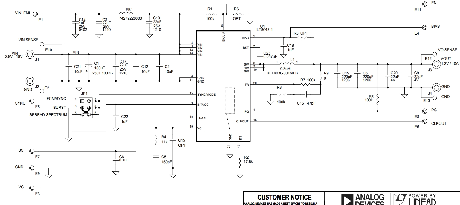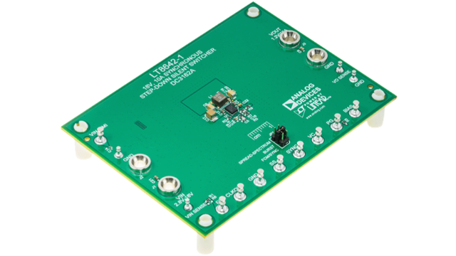 演示电路3162A是一款18V、10A的同步降压Silent Switcher®,内置LT8642-1芯片。这款电路板设计用于提供1.2V的输出电压,并且可以接受2.8V至18V的输入电压。LT8642-1是一款紧凑型、低辐射、高效率和高速同步单芯片降压型开关稳压器。其特殊的Silent Switcher架构设计,旨在最大限度地减少EMI辐射。该电路板还具备展频调制功能,可选的展频模式可以进一步改善EMI性能。LT8642-1的开关频率可以通过电阻或外部时钟在200kHz至3MHz范围内进行编程,演示电路3162A的默认频率为2MHz。电路板上的LT8642-1 SYNC/MODE引脚默认接地,实现低纹波Burst Mode®工作模式。通过移动JP1跳线,可以选择展频模式或强制连续模式。如果需要同步到外部时钟,可以将JP1跳线移至SYNC位置,并将外部时钟信号施加于FCM/SYNC端子。LT8642-1芯片采用3mm × 4mm LQFN封装,并具有裸露焊盘以实现低热阻。为了实现低EMI运行和出色的热性能,建议参考数据手册中的“低EMI PCB布局和散热考虑因素”部分进行布局设计。