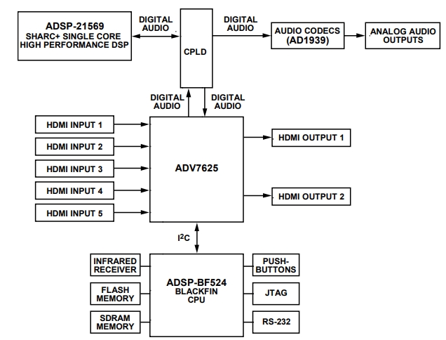 EVAL-MELODY-8评估板是一个专业平台,旨在让用户评估Analog Devices, Inc.(ADI公司)的高质量数字音频信号解码产品。该评估板配备了Blackfin® ADSP-BF524处理器,负责系统控制,以及SHARC® ADSP-21569,这是一款SHARC+®单核高性能数字信号处理器,专门用于音频解码。此外,评估板还集成了支持高带宽数字内容保护(HDCP)1.4技术的ADV7625高清晰度多媒体接口(HDMI®)收发器。用户在订购EVAL-MELODY-8评估板时,必须持有HDCP 1.4技术的授权许可。在使用该评估板时,应参考ADSP-21569和ADSP-BF524的数据手册以及本用户指南。