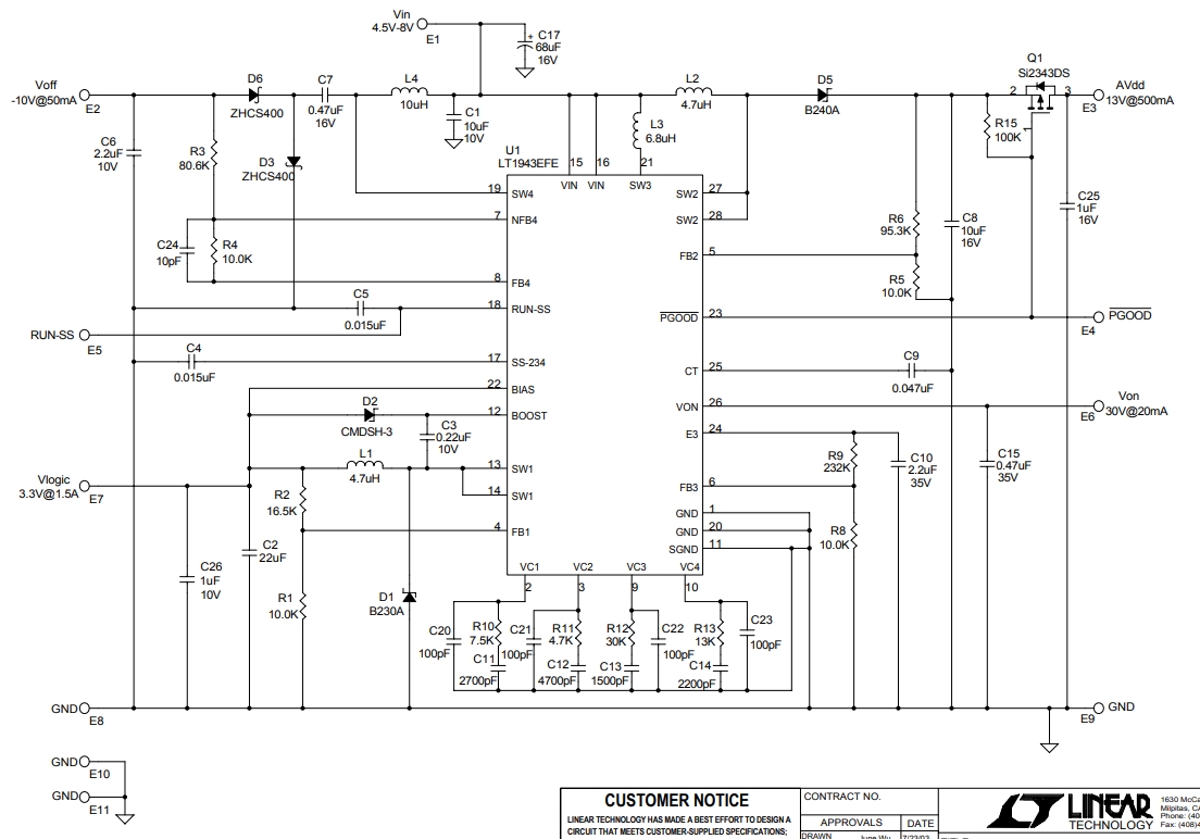 DC697A是一款专为5V输入TFT-LCD面板设计的高电流四通道输出稳压器演示板。它采用了LT1943EFE芯片,能够提供高达1.5A的3.3V逻辑电源,以及30V@20mA的Von输出。该板设计用于与线性技术(Linear Technology)的部件配合使用,确保了电路的高性能和可靠性。电路设计时已尽力满足客户供应的规格,但客户有责任验证在实际应用中的适当和可靠操作。组件替代和印刷电路板布局可能会显著影响电路性能或可靠性。如需帮助,请联系线性技术应用工程部门。