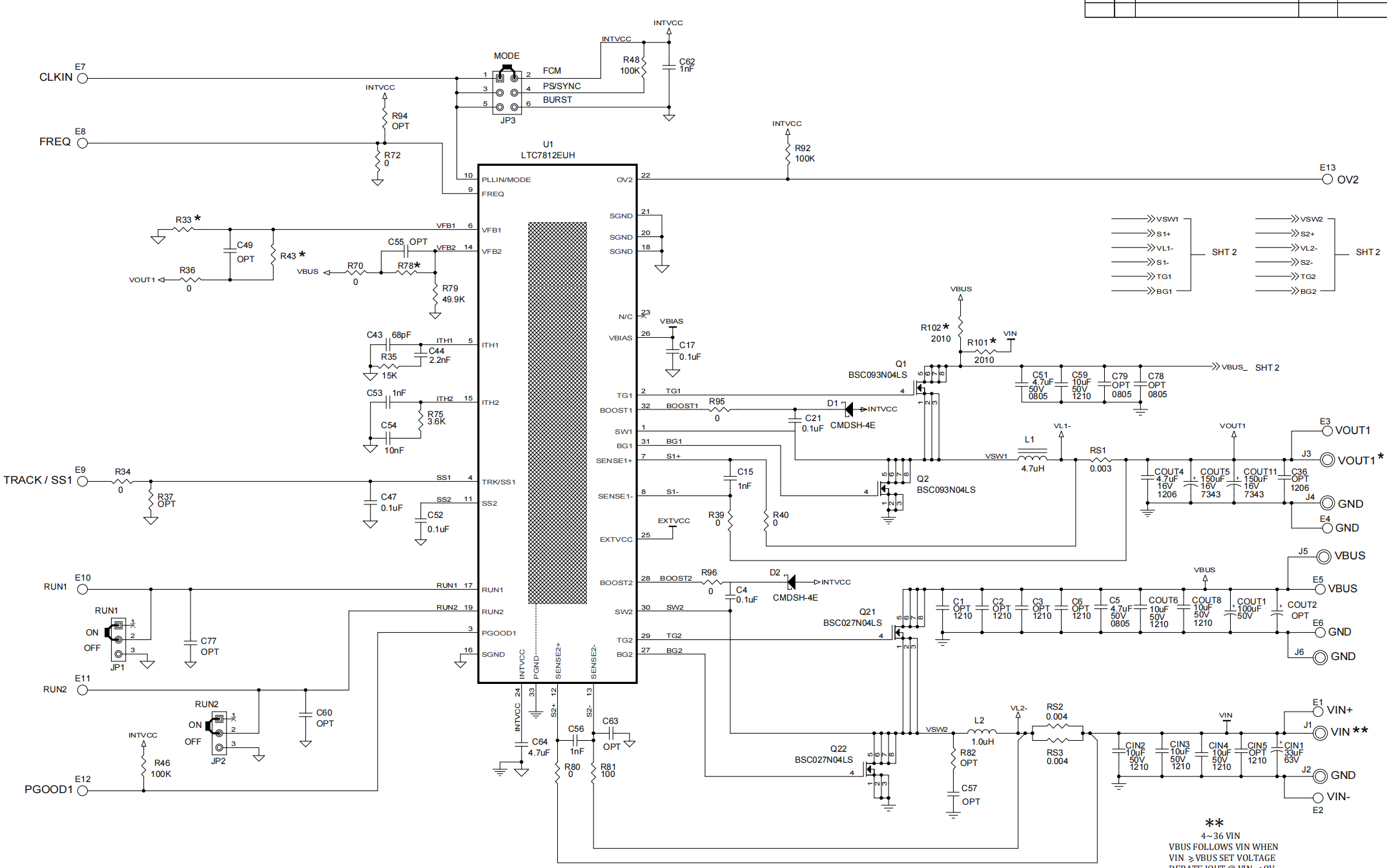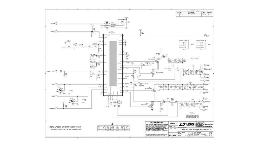 演示电路DC2422A是一个升压+降压DC/DC转换器,采用了LTC7812EUH,这是一个高性能的双输出(升压+降压)同步DC/DC开关调节控制器。该板具有4V至36V的输入电压范围和三种不同的输出配置。DC2422A-A使用升压和降压转换器组合生成稳定的12V @ 8A输出。DC2422A-B提供10V至16V之间的准调节输出电压;该电路将低于10V的电压升至10V,通过10V至16V之间的电压,并把高于16V的电压降至16V,提供一个松散调节的12V总线。DC2422A-C将输入电压升至12V,然后将此电压降至5V @ 8A,模拟一个设计为即使在低至4V的冷启动条件下也能提供5V输出功率的电源。