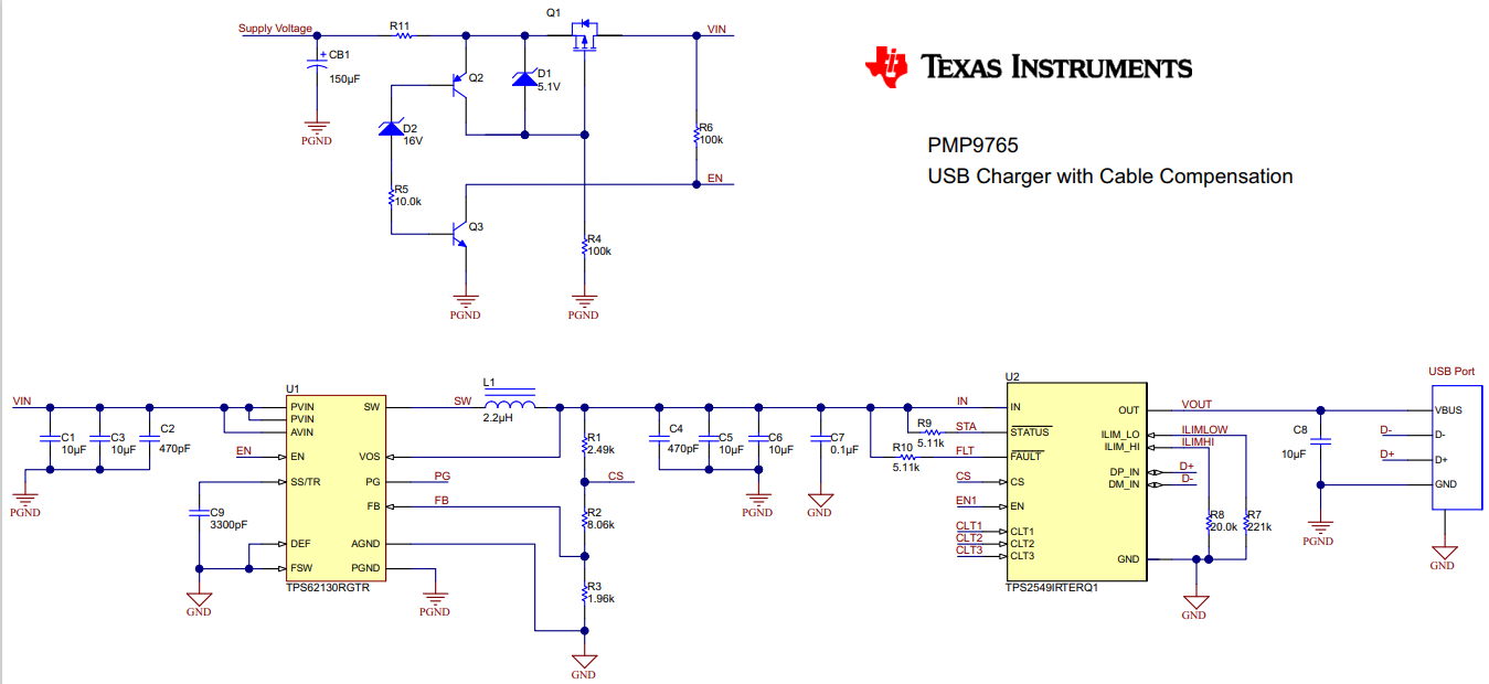 此参考设计包括能够在汽车应用环境中控制远程 USB 充电端口的电源管理电路。该电路可直接由汽车蓄电池轨供电。它使用一个小型高效降压转换器 TPS62130A-Q1 来调节所需的 USB 总线电压,以便使用高达 2.5A 的充电电流进行充电。该 USB 充电端口通过使用 USB 充电控制器 TPS2549-Q1 予以控制和保护;此充电控制器还用于监控充电电流以便调节 TPS62130A-Q1 的输出电压。凭借这种方式,从电缆连接到 USB 端口的压降便获得补偿。此外,TPS2549-Q1 生成所有必需的信号来指示设备连接到的 USB 充电端口。该 USB 充电端口通过使用 USB 充电控制器 TPS2549-Q1 予以控制和保护;此充电控制器还用于监控充电电流以便调节 TPS62130A-Q1 的输出电压。凭借这种方式,从电缆连接到 USB 端口的压降便获得补偿。此外,TPS2549-Q1 生成所有必需的信号来指示设备连接到的 USB 充电端口。