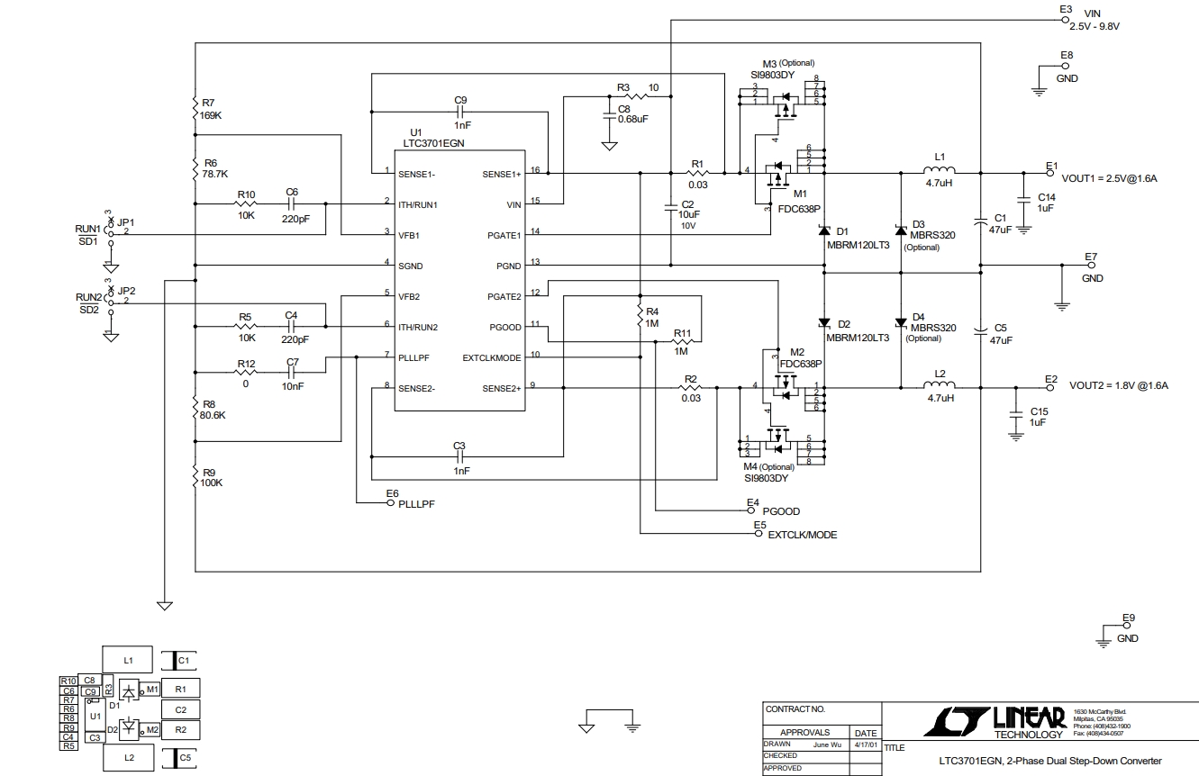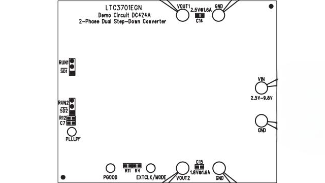 DC424A是一款展示LTC3701芯片的参考设计电路板,该芯片是一款2相、低输入电压的双通道降压DC/DC控制器。该电路板具备两个输出电压通道,分别为2.5V@1.6A和1.8V@1.6A,确保了高效率的电源转换。电路板设计考虑了多种可选配置,例如外部时钟输入、模式选择等,以适应不同的应用需求。关键元件包括电容器、电阻器、二极管、MOSFET和电感器等,这些元件共同工作以实现稳定的电源输出。