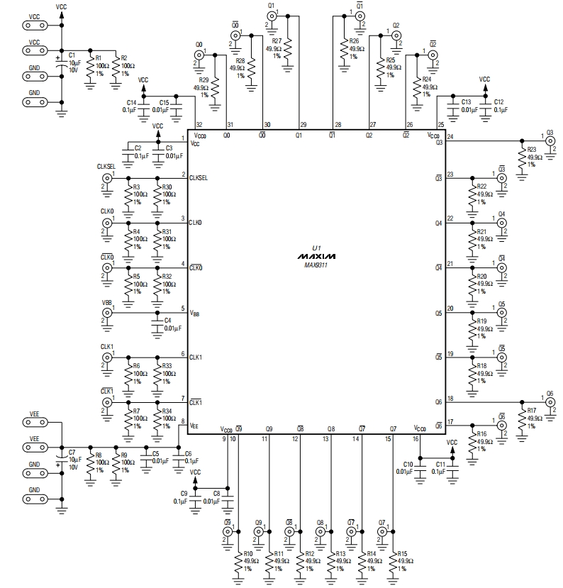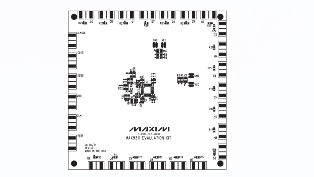 MAX9311评估板(EV kit)是一款专为时钟分配设计的低扭曲1至10差分驱动器评估套件。该评估板不仅支持高达3GHz的LVECL/LVPECL测试,还能够从两个输入源中选择并复现10路相同的差分输出。输入信号可以是差分信号或单端信号,后者通过使用片上基准电压VBB实现。此外,MAX9311评估板也适用于评估MAX9312、MAX9313和MAX9314芯片。