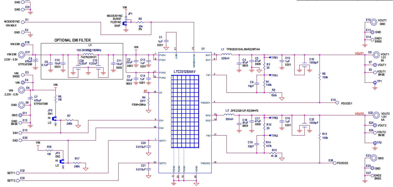 DC3091A是一款高性能的双通道降压型DC/DC稳压器演示板,内置LTC3312SA芯片,专为需要严苛性能和节省空间的应用设计。该电路板配置为3.3V输入,支持2MHz开关频率,能够提供1.2V和1.8V的双通道6A输出,或双相12A的输出能力。LTC3312SA芯片采用紧凑的3mm × 4mm封装,使得DC3091A演示板在保持高性能的同时,也具有出色的空间效率。电路板支持脉冲跳跃、强制连续和Burst Mode®突发工作模式,用户可以通过JP1跳线选择所需的工作模式。此外,电路板还集成了EMI滤波器,适用于对噪声敏感的应用场景,通过VIN EMI端子可以为EMI滤波器供电。评估或修改此演示电路时,应结合LTC3312SA数据手册和演示手册进行。