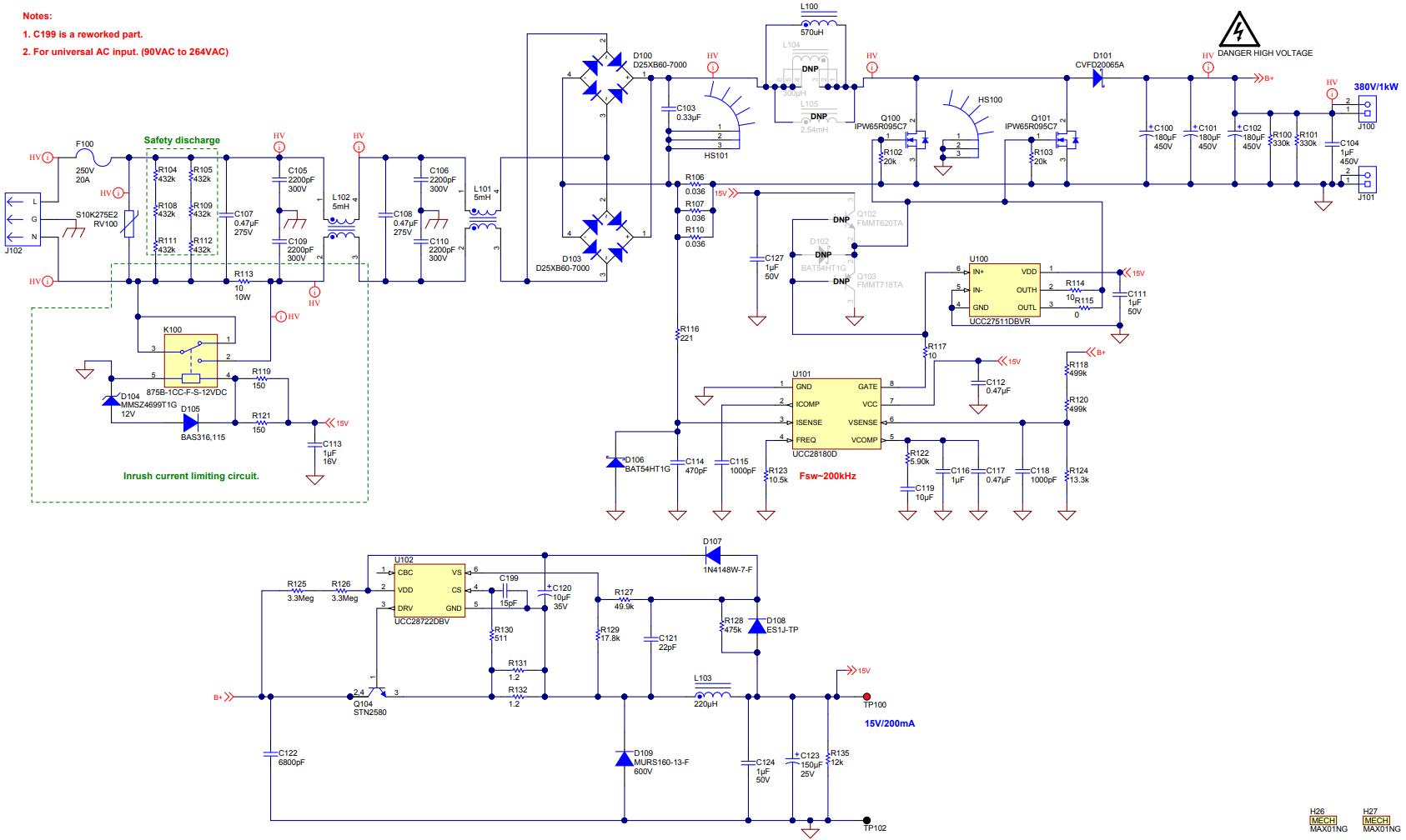 PMP11211 参考设计使用 UCC28180 CCM PFC 控制器,从通用交流输入生成 380V/1kW 输出。此外,UCC28722 PSR 控制器还在该设计中用作偏置电源。在 120VAC/60Hz 输入下可实现超过 94% 的峰值效率,在 230VAC/50Hz 输入下可实现超过 97% 的效率(开关频率为固定的 200kHz)。