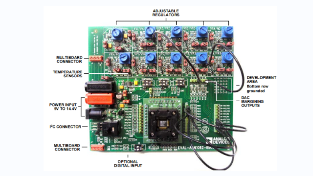 EVAL-ADM1062TQEBZ 至 EVAL-ADM1169LQEBZ 评估板配备了多种元件,包括用于模拟不同输入电压的十个可调节电压调节器(LDO),这些调节器均来自Analog Devices公司。每个调节器都可以通过板上的旋转电位器手动独立调节输出电压。评估板还包括用于数字输入仿真的开关控制,以及用于连接外部设备的插座和跳线。此外,评估板支持多板级联设置,允许多个评估板连接在一起,以评估复杂的级联序列设置。