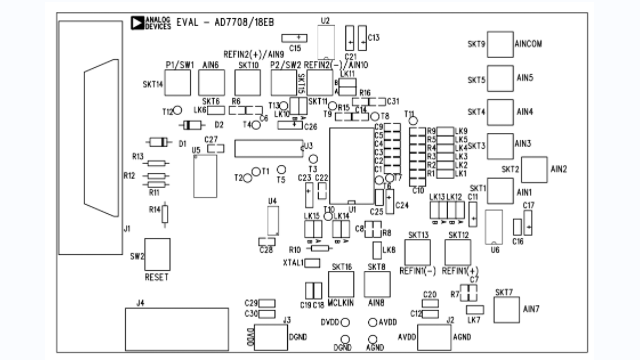 AD7708评估板是一个为低频测量应用设计的完整模拟前端,采用16位Sigma-Delta模数转换技术,提供高精度的模拟信号数字化。板上集成了多种链接选项和数字缓冲器,允许用户轻松编程AD7708。评估板还包括两个AD780精密2.5V参考源、一个32.7680 kHz晶体振荡器,以及用于与PC通信的数字缓冲器。软件支持通过IBM兼容PC的并行端口进行控制,具有数据读取、显示、存储和噪声分析等功能。