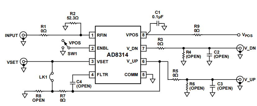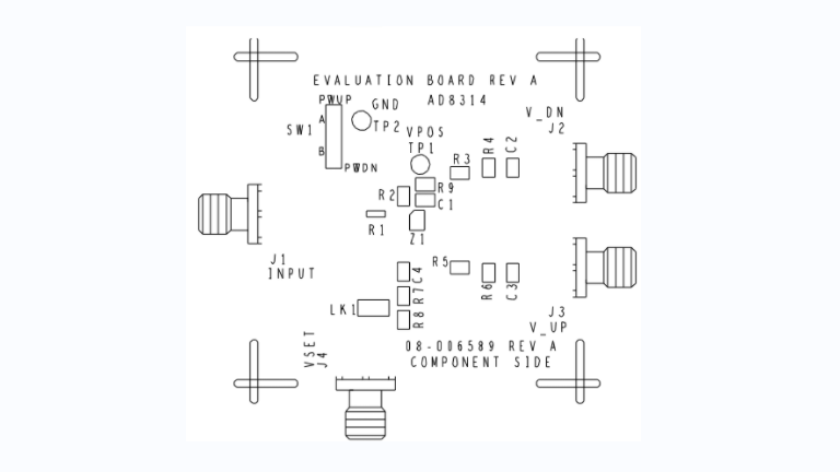 AD8314ACP-EVAL 是一款配置齐全的4层FR4评估板。正常工作时,它需要2.7V - 5V/10 mA电源。应将电源连接到标有VPOS和GND的矢量引脚。RF输入信号施加于边缘安装型SMA RF连接器(INPUT)。设定点输入信号施加于边缘安装型SMA连接器(VSET)。检波器输出信号可通过边缘安装型SMA连接器(V_UP、V_DN)访问。该电路板可以支持测量模式和控制器模式,具体取决于跳线的状态(LK1)。 AD8314-EVAL 是一款配置齐全的4层FR4评估板。正常工作时,它需要2.7V - 5V/10 mA电源。应将电源连接到标有VPOS和GND的矢量引脚。RF输入信号施加于边缘安装型SMA RF连接器(INPUT)。设定点输入信号施加于边缘安装型SMA连接器(VSET)。检波器输出信号可通过边缘安装型SMA连接器(V_UP、V_DN)访问。该电路板可以支持测量模式和控制器模式,具体取决于跳线的状态(LK1)。