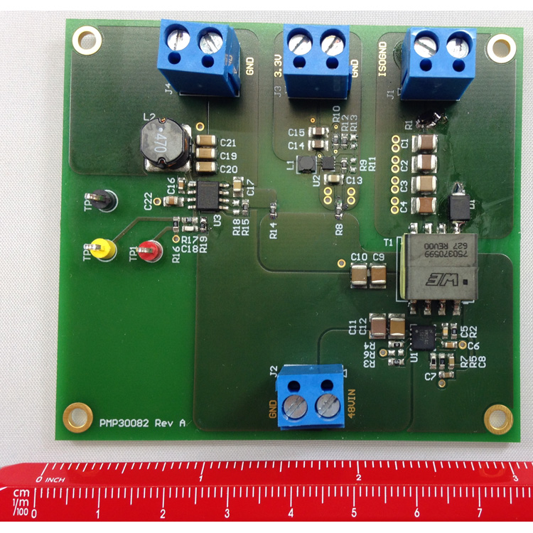 PMP30082 参考设计展示了两级电源。第一级为 Fly-Buck 拓扑,将 48V-72V 的输入转换为 12V 的主输出电压(最大负载电流为 250mA)以及 24V 的隔离式辅助输出电压(负载电流为 160mA)。两个降压转换器被连接到 12V 的主轨。一个生成 5V 电压(负载电流为 400mA),另一个生成 3.3V 电压(负载电流为 100mA)。