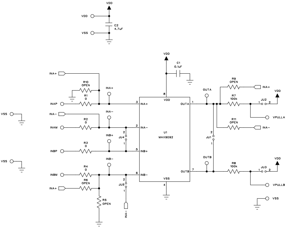 MAX9092评估板(EV kit)是一个经过验证的电路设计,专为评估MAX9092双路比较器而设计。用户可以通过安装跳线和更换少量元件,轻松配置评估板以支持多种比较器应用,包括窗口检测器和脉宽调制(PWM)发生器。板载提供了0603封装元件的PCB焊盘,以便进行评估。该评估板能够在+1.8V至+5.5V的VDD电源范围内工作。评估板预装有MAX9092AKA+芯片,若需要引脚兼容的MAX9093AKA+,需联系工厂获取。此评估板适用于汽车电池供电产品、通用低压应用、便携式设备、移动通信、笔记本电脑和PDA等多种应用场景。