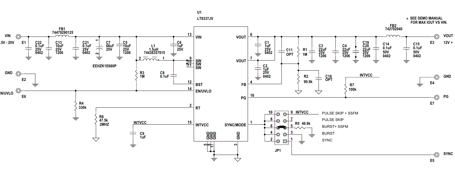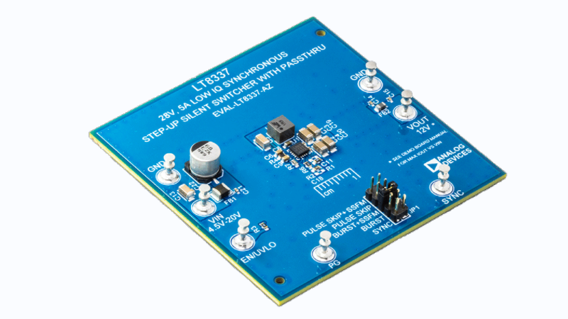 EVAL-LT8337-AZ 是一款评估电路板,搭载了 LT8337 升压型转换器 IC,这是一款 2MHz 低噪声、低静态电流的同步升压转换器,适用于 4.5V 至 12V 的输入电压,并能够提供稳定的 12V 输出。当输入电压 VIN 超过 12V 时,LT8337 能够平滑地在调节模式和 PassThru™ 模式之间转换。该评估板采用了展频(SSFM)、Silent Switcher® 技术和集成的 EMI 滤波器,以确保优秀的 EMI 性能。升压转换器设计能够提供最高 1.2A 的输出电流,具体取决于输入电压,同时在关断状态下具有极低的静态电流,非常适合汽车和电池供电的应用场景。评估板提供了 PULSE SKIP 和 BURST 模式的选择,通过跳线 JP1 可以进行设置,两种模式都能在轻负载下实现低静态电流。LT8337 适用于 2.7V 至 28V 的宽输入电压范围,适合多种应用,包括汽车、电信和工业领域。它具备 4μA 的超低静态电流,支持 300kHz 至 3MHz 的可调和同步操作,以及在轻负载下可以选择的 PULSE SKIP 或低纹波 BURST 模式,以提高效率。此外,LT8337 还具备软启动、输入欠压锁定、可调开关频率和时钟同步等特性。Power Good (PG) 信号指示输出电压处于稳定状态。LT8337 采用小型的 16 引脚塑料 LQFN 封装,有助于实现紧凑的尺寸和优秀的热性能。为了完整了解 LT8337 的特性和应用,应结合 EVAL-LT8337-AZ 演示手册和 LT8337 数据手册一起阅读。