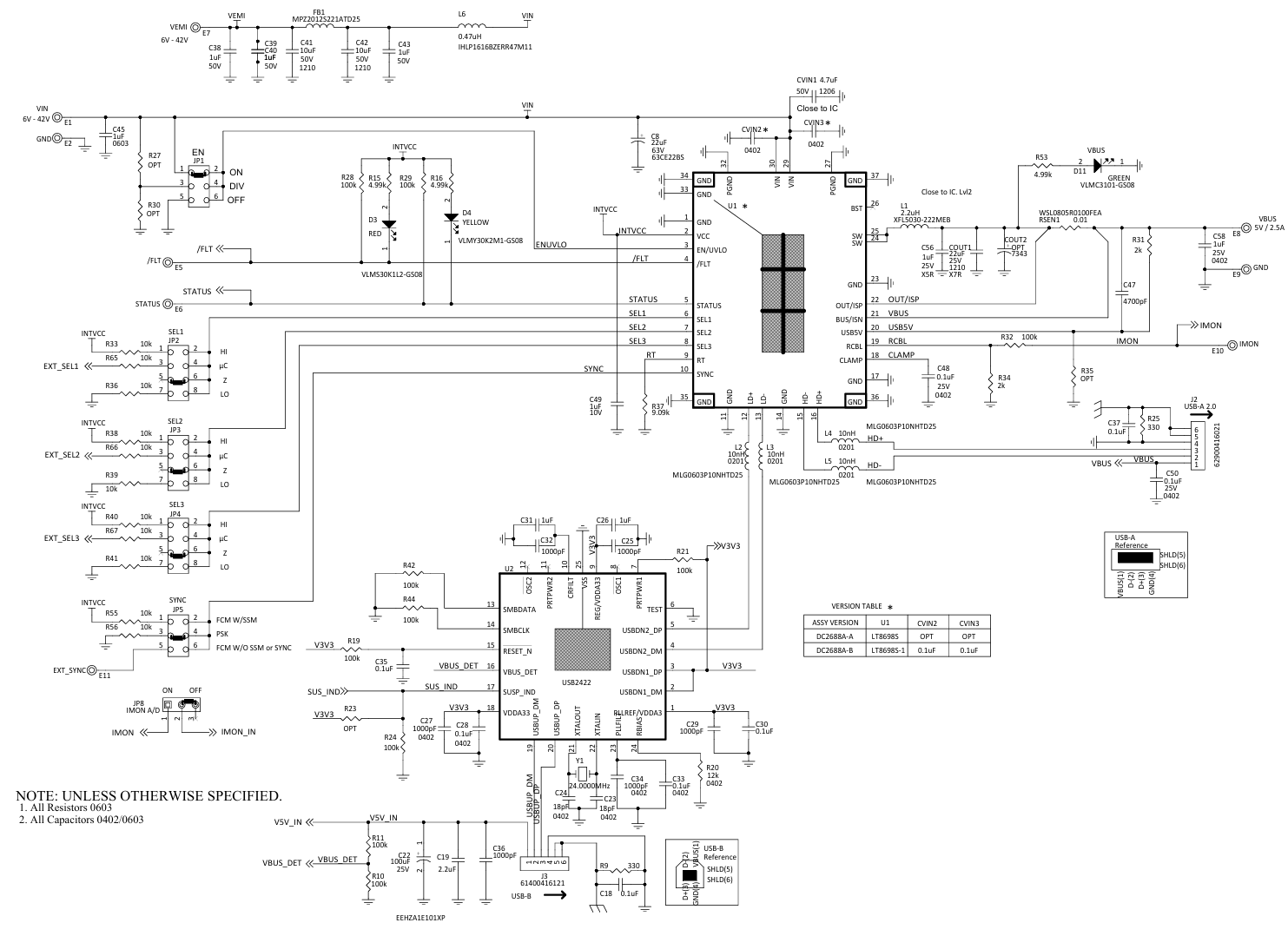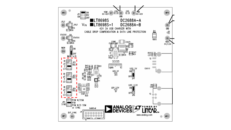 演示电路DC2688A是一款设计用于从高达42V的输入电压为5V USB VBUS轨提供高达3A电源的USB充电器。该电路采用了LT8698S/LT8698S-1芯片,这是一款紧凑、高效、高速的同步单片降压型开关稳压器,具备第二代Silent Switcher®技术,能够显著减少电磁干扰(EMI)并降低对PCB布局的敏感性。LT8698S/LT8698S-1支持多种便携设备充电器配置文件,包括USB BC 1.2 CDP、DCP和SDP,以及常见的专有充电器配置文件,这些都能通过DC2688A演示板进行轻松评估。此外,LT8698S/LT8698S-1还具备高速USB 2.0兼容数据线开关、强大的数据线保护和可编程线缆压降补偿功能,确保即使USB插座通过长电缆与稳压器分离,也能维持准确的5V VBUS调节。这些特性使得LT8698S/LT8698S-1非常适合汽车USB主机应用。DC2688A有两个版本:DC2688A-A配备LT8698S,而DC2688A-B配备LT8698S-1。两者的主要区别在于LT8698S在IC封装内部集成了VIN热环路电容器,以提升EMI/EMC性能,而LT8698S-1则未集成这些电容器。