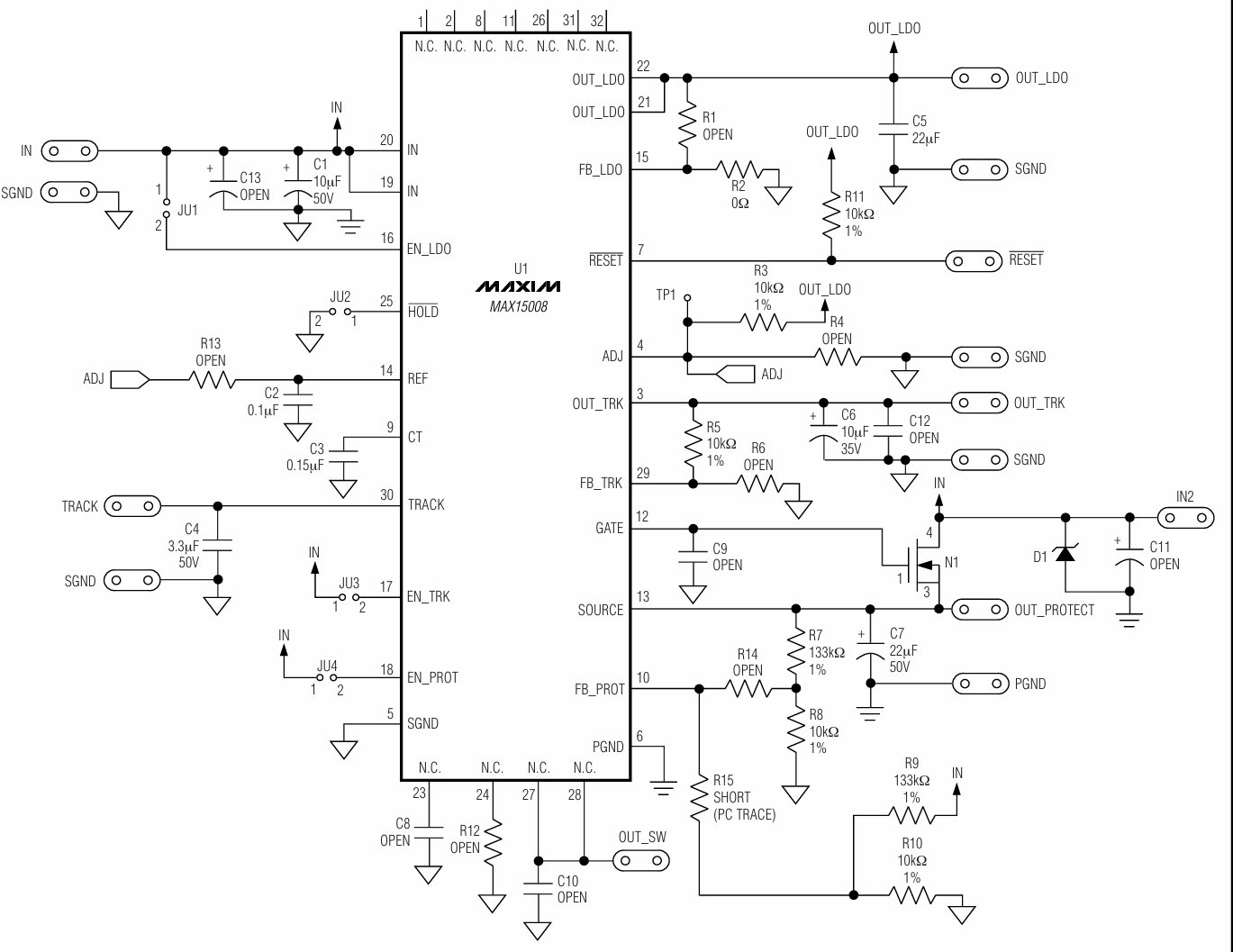 MAX15008评估板(EV kit)是一款全面组装并经过测试的印刷电路板(PCB),专门用于展示MAX15008芯片的功能。该芯片集成了可配置的低压差(LDO)稳压器、电压跟踪器和过压保护器。LDO稳压器被设置为5V输出,能够提供高达300mA的电流。电压跟踪器配置为跟踪LDO的输出电压,并能提供最多50mA的电流。过压保护器的阈值设定为17.7V。评估板还配备了一个/RESET输出信号,用于指示输出故障和正常运行状态。此外,该评估板也适用于评估MAX15009、MAX15010或MAX15011系列IC。它在AM/FM无线供电、环境控制、仪表盘多媒体、电源和远程信息处理等领域有广泛应用。