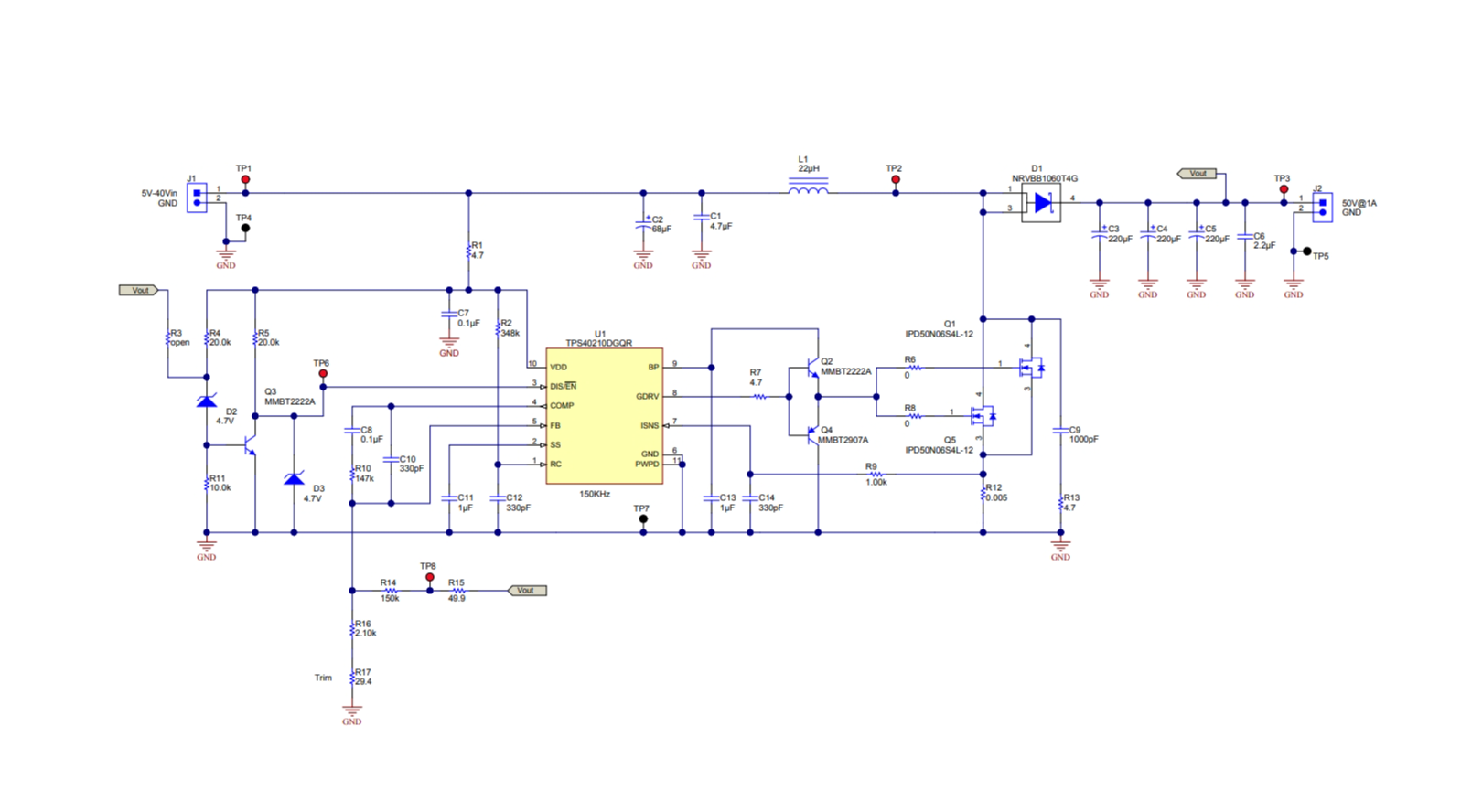 此 50V/1A 升压转换器设计为以标称 12V 输入电压运行,但会在 5V - 40V 的汽车类范围中运行。此设计的成本低,且仅需要 50mm x 50mm 的面积。