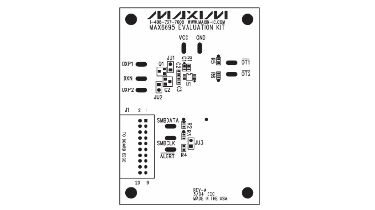 MAX6695评估板(EV kit)是一个经过完全安装和测试的PCB,搭载了MAX6695芯片。该评估板设计用于全面评估MAX6695温度监视器的性能。MAX6695能够监视自身的芯片温度以及两个以二极管形式连接的外部晶体管的结温。该器件将温度转换为11位的串行数据,并通过2线制串行总线进行访问。