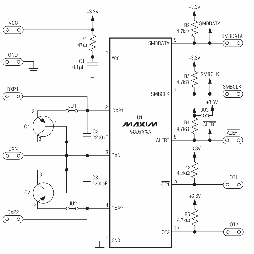 为了基于PC全面评估MAX6695,建议订购MAX6695EVCMOD2。如果用户已经拥有SMBus接口,则可以订购MAX6695EVKIT。此评估板适用于台式计算机、笔记本电脑、服务器、测试与测量设备以及工作站。