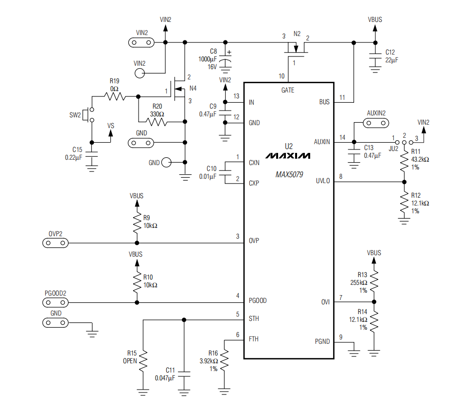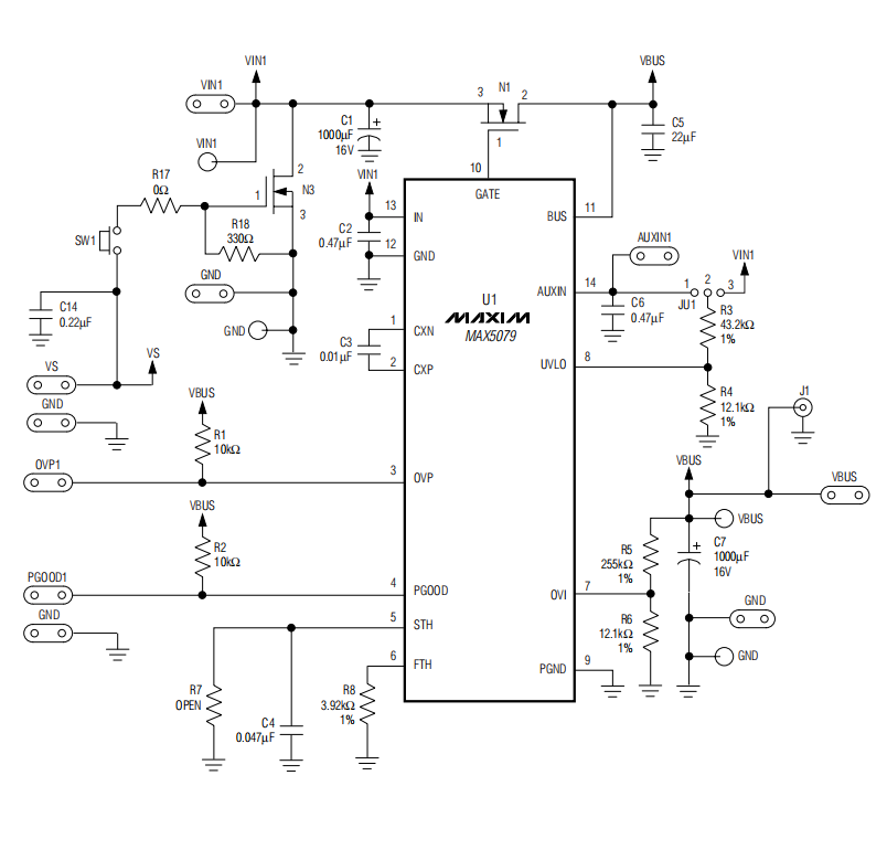 MAX5079评估板(EV kit)用于演示并联电源系统中MAX5079 “或” MOSFET控制器的功能。该评估板采用“或” MOSFET并联连接两个电源,可模拟故障状态,并演示故障状态下电源总线的隔离功能。该评估板采用3.0V至12.6V输入电压。外部欠压锁定门限设置为3.0V,过压门限设置为13.2V。如果重新配置电路且选用额外的辅助电源,工作电压可以低至1V。配合n沟道MOSFET,MAX5079控制器可实现正向压降极低的二极管功能。 该评估板上的MAX5079控制器分别监视VIN1和VIN2的输入电压,并与电源总线电压VBUS比较。当VIN_电压升至高于VBUS电压时,MOSFET快速导通。如果任意一路VIN_电源电压降至低于VBUS,则MAX5079以2A (典型值)吸入电流对MOSFET栅极放电,并在200ns (典型值)内关断MOSFET,与总线有效隔离。应用基站线卡N+1冗余电源系统网络线卡可并联的DC-DC转换器模块RAID服务器