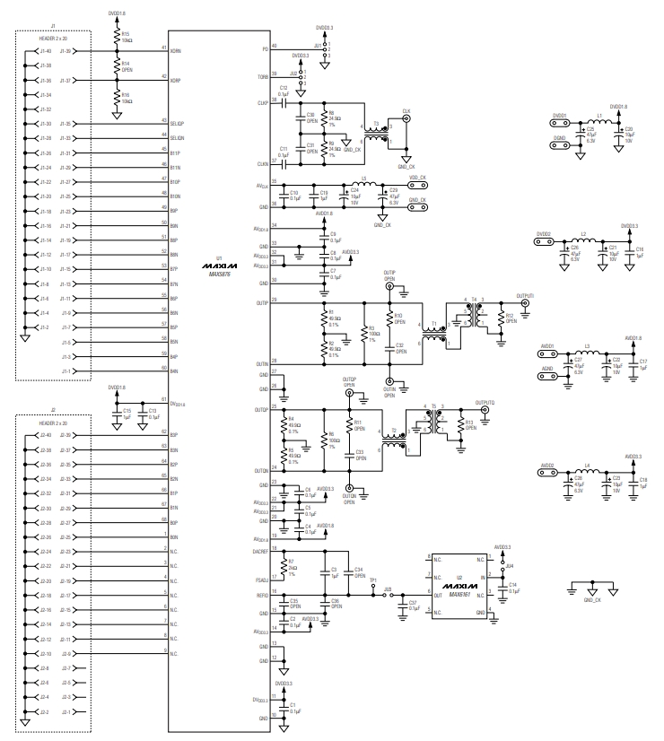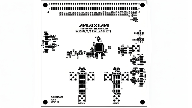 MAX5876/MAX5877/MAX5878评估板(EV kit)是一套经过全面装配和测试的印刷电路板(PCB),专为评估MAX5876(12位)、MAX5877(14位)和MAX5878(16位)数字至模拟转换器(DAC)的性能而设计。这些DAC具有250Msps的处理速度、双通道配置、交错LVDS输入、集成1.2V电压基准和差分电流输出。评估板支持LVDS兼容的数字数据输入和单端时钟输入,并可通过3.3V/1.8V双电源供电,简化了电路板的运作。此外,评估板还配备了外部1.25V电压基准电路,用于驱动DAC的输入基准电压引脚。这些评估板适用于ATE基站、通信设备如单载波/多载波UMTS、CDMA、GSM的电缆调制解调器终端系统(CMTS)、固定宽带无线接入、点到点微波通信以及直接数字合成器(DDS)设备。