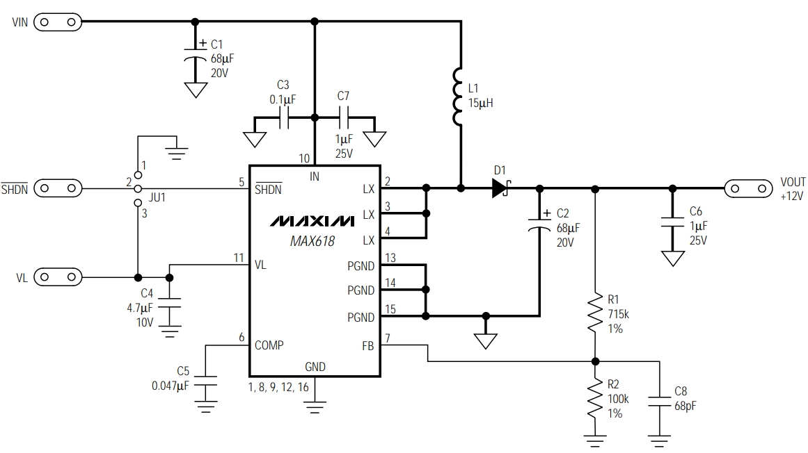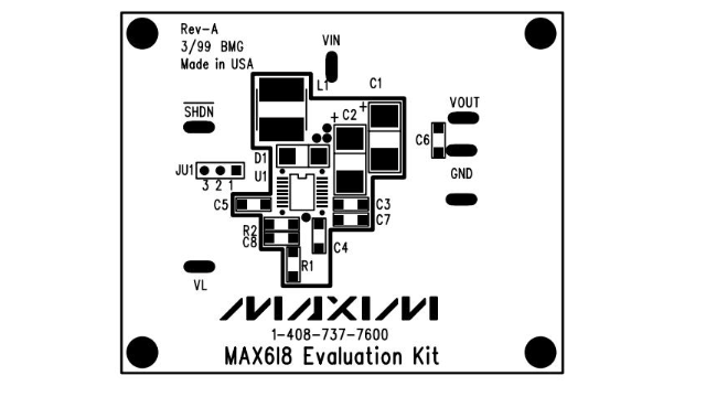 MAX618评估套件(EV套件)是一款高效的升压型开关稳压器,具备恒定频率和PWM控制功能,并内置了一个2A、28V的n沟道MOSFET。这款评估套件能够接受从+3V到VOUT的输入电压,并将其转换为12V的输出电压,同时提供高达500mA的输出电流。其转换效率超过90%,工作频率为250kHz,使得可以使用小型外部元件。MAX618评估套件是完全装配和测试过的表面贴装电路板,适用于汽车电源DC-DC转换器、工业+24V和+28V系统、LCD显示器和掌上电脑等多种应用。