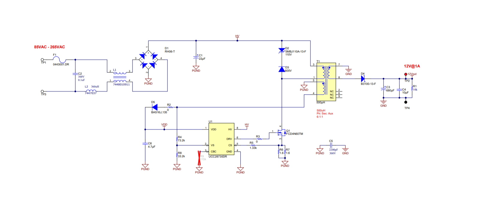PMP20634 参考设计是一种隔离式 DCM 反激设计,可提供 85V 到 265V 的通用交流线路输入,并产生一个能承受 12W 负载的 12V 输出。该设计使用 UCC28730 控制器,可在无负载的情况下实现超低待机功耗。它可在高压和低压线路中实现 85% 的效率,在 2 层电路板上的尺寸为 1 x 3 英寸。