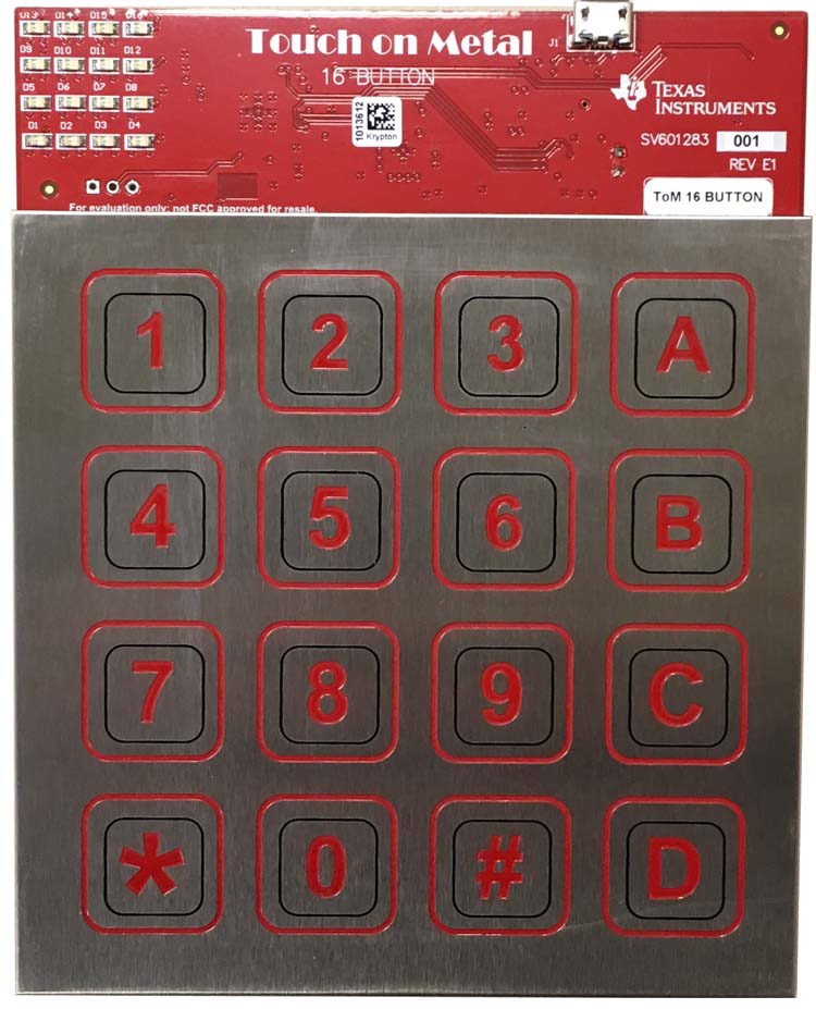 这款 16 按钮不锈钢键盘采用 TI 的感应式触摸技术,在单片 0.6 毫米厚的不锈钢金属上展示了高灵敏度按钮。该设计利用 MUXed 方法通过单个 LDC1614 实现多个按钮。该设计适用于完全封闭系统的任何金属或非金属表面,实现时尚的防水 (IP67) 设计。