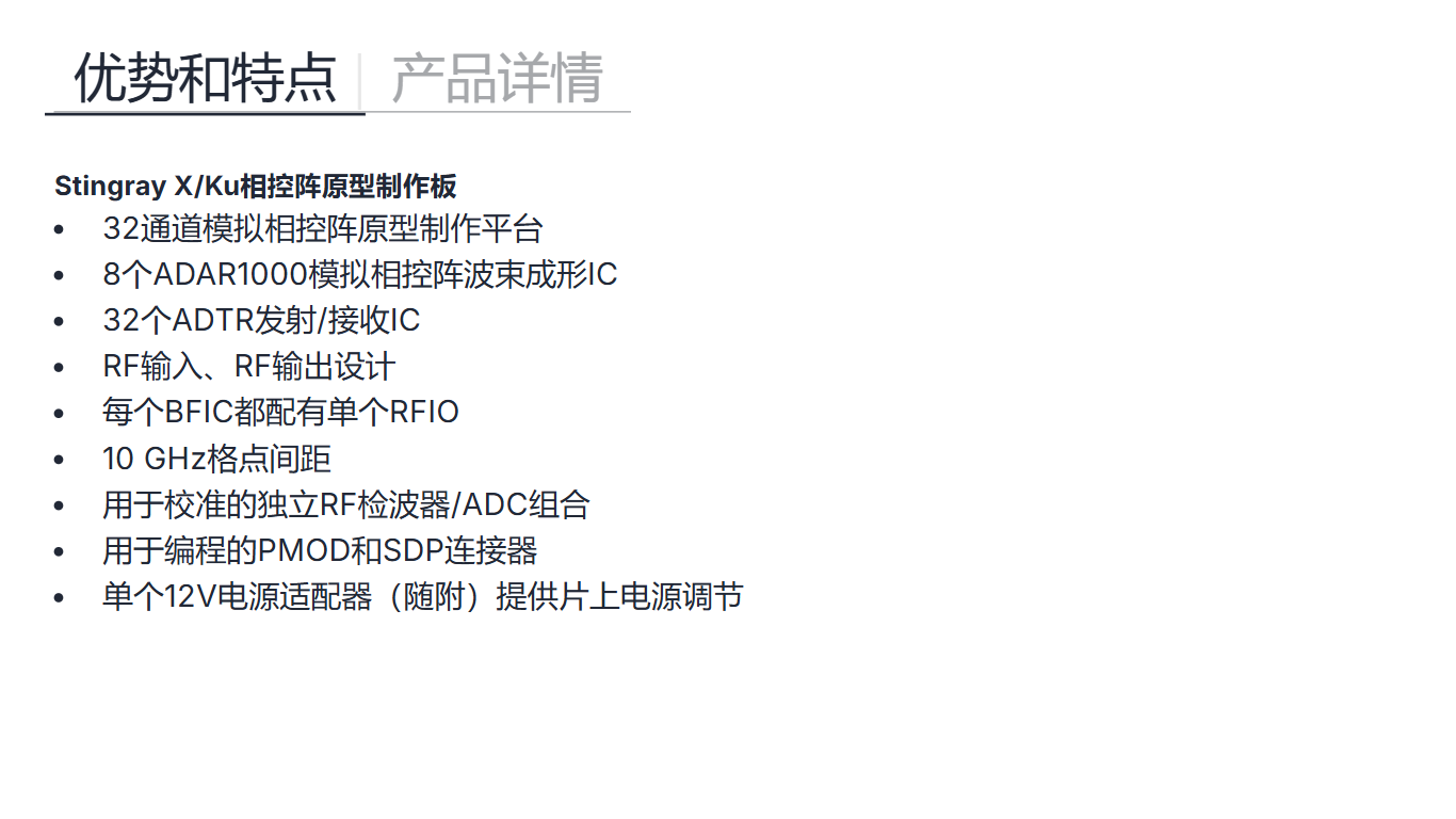 X波段开发平台是一个集成了多种功能的高级电路板,专为相控阵雷达、电子战和地面卫星通信等应用设计。它包括一个MxFE®软件定义的直接RF采样收发器、X波段转C波段的上下变频器,以及X/Ku波段的模拟相控阵原型制作平台。这个平台特别适用于X波段的32发射/32接收通道混合波束成形相控阵雷达。它不仅提供了一个完整的系统解决方案,还可以作为测试平台,用于演示混合波束成形相控阵雷达,实现系统级校准、波束成形算法和其他信号处理算法的验证。