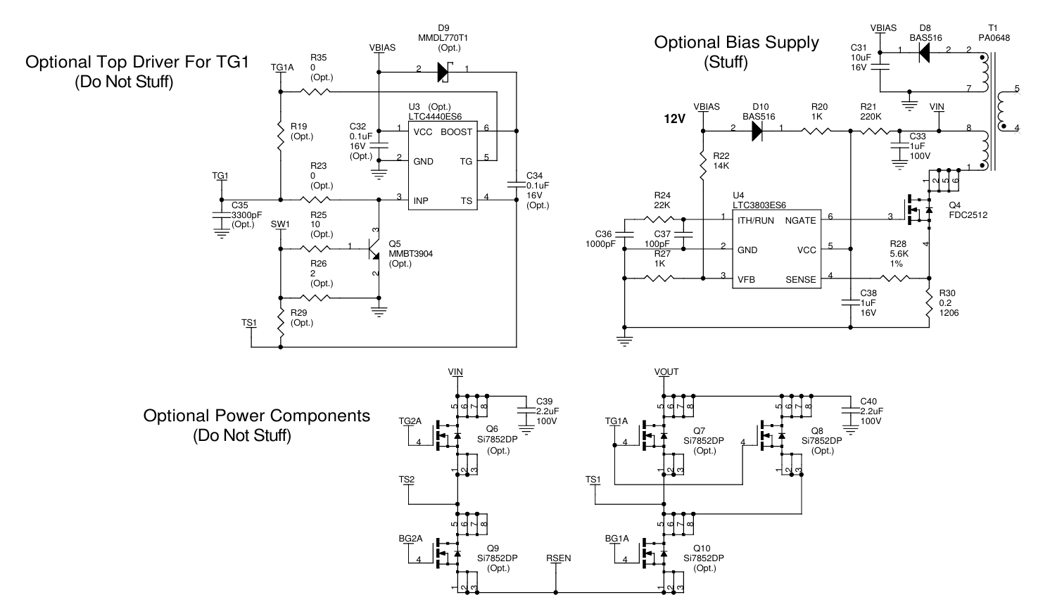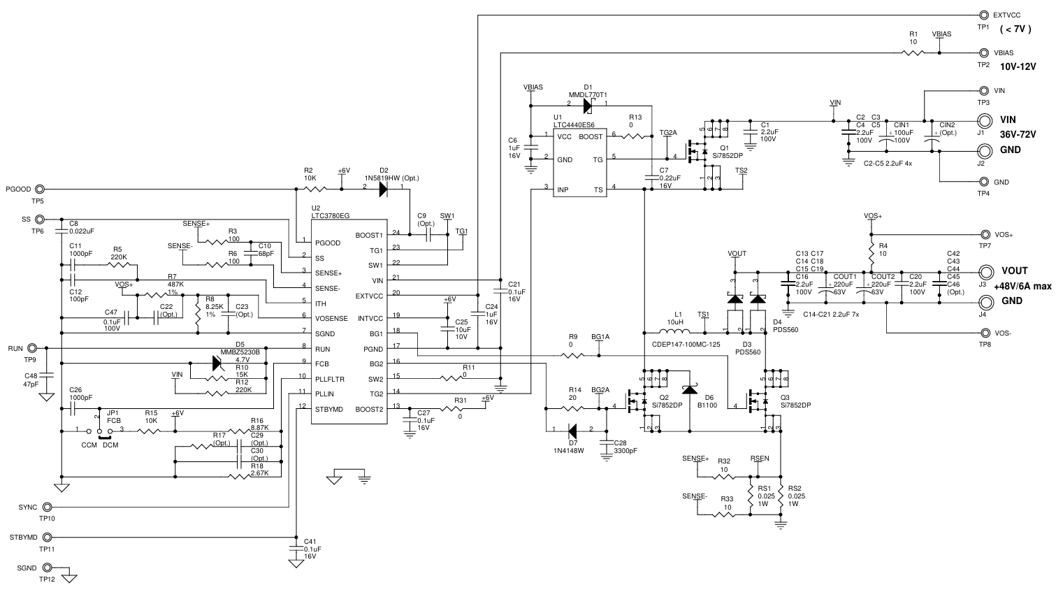 演示电路1046A是一款高效率的非隔离式降压-升压型DC/DC电源转换器,内置了LTC3780EG和LTC4440ES6两款芯片。LTC3780是一款高性能的四开关同步降压/升压稳压器,而LTC4440则是一款额定电压为100V的FET驱动器。该电路板设计用于输入电压范围为36V至72V,输出电压为48V。在25°C的室温条件下,若无冷却风扇,其最大输出电流可达5A;而在提供150LFM气流进行散热的情况下,最大输出电流可提升至6A。此外,该电路板还配备了一个可选的12V偏置反激式电源,使用LTC3803芯片,为LTC3780和LTC4440提供电源。