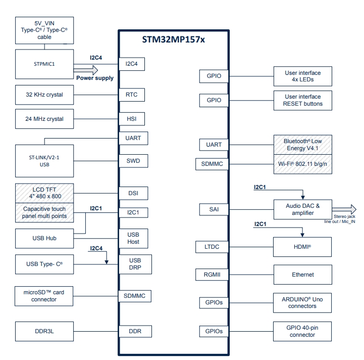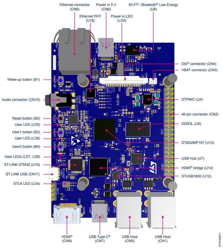 - 它们具备1-Gbit/s以太网(RGMII)、USB OTG HS、音频编解码器、4个用户LED、2个用户和复位按钮以及1个唤醒按钮。电源输入支持5V/3A USB Type-C。