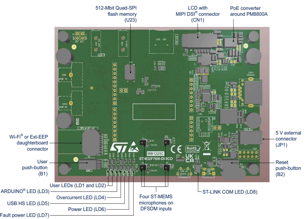 - 可选的显示配件包括HDMI和DSI适配器。板载有SAI音频编解码器和四个数字ST MEMS麦克风,通过DFSDM输入。此外,还集成了128兆位的SDRAM和512兆位的四路SPI闪存。