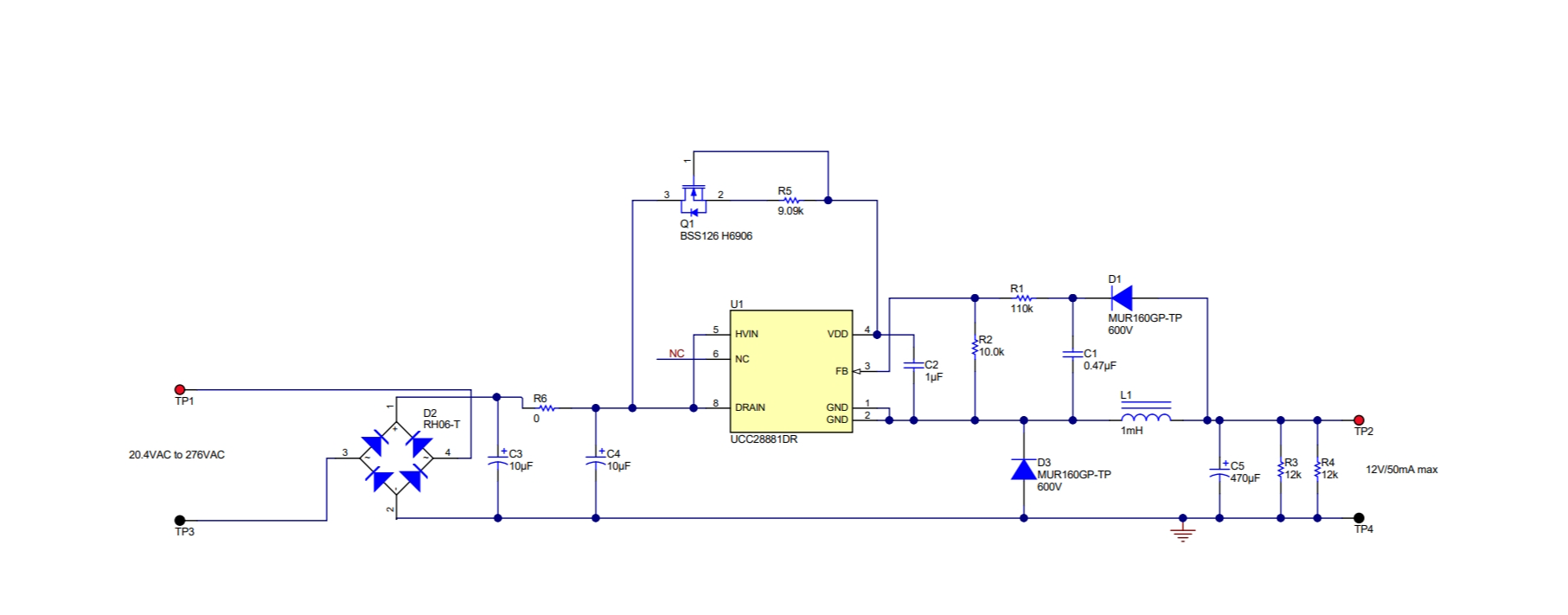 这是一款超宽输入范围(20.4Vac 至 276Vac)交流/直流降压转换器参考设计。使用 UCC28881 控制器,我们只需要极少数量的分立式元件作为主开关,高电压启动电路(需要低静态电流)已经集成在控制器中。为了向 UCC28881 控制器提供足够的电源电流,添加了耗尽型 MOSFET 电路作为低功率耗散电流源。该设计能够提供 12V/50mA 输出。