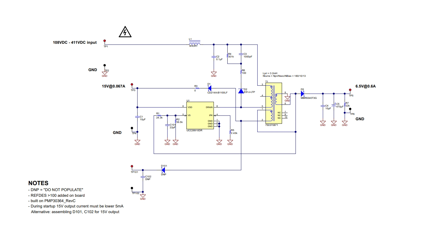 该离线反激式参考设计使用 UCC28910 控制器,可通过直流输入 (108VDC - 411VDC) 生成 2 个非隔离式输出(6.5V,600mA;15V,67mA)。UCC28910 包含一个 700V 功率 FET 和一个高压电流源(用于启动),以实现低待机功耗。谷底开关技术可降低开关损耗,并保持高效率。控制器无需使用光耦合器即可提供恒压、恒流调节。