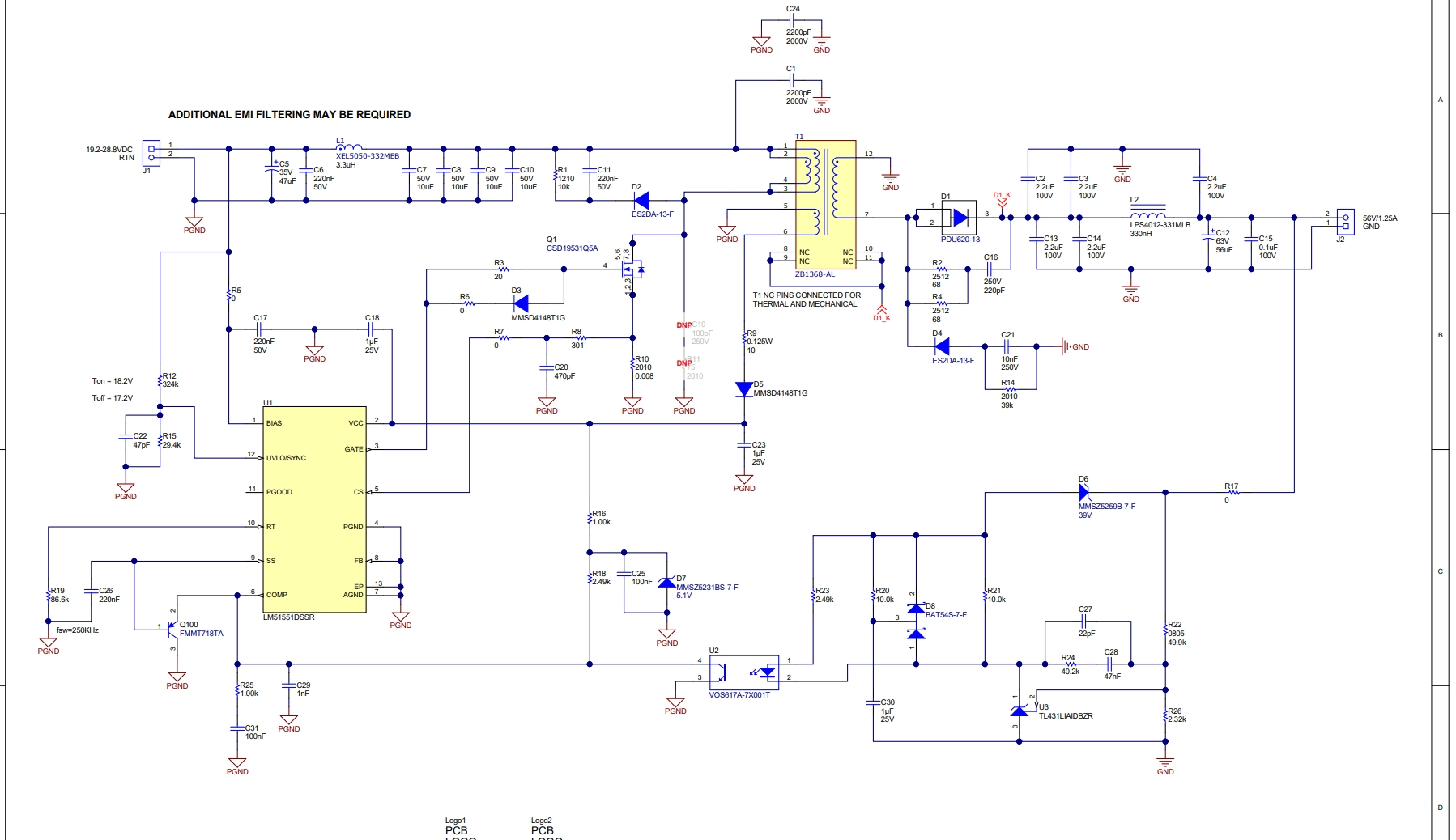 此参考设计采用二极管整流反激式转换器,可通过 24V 输入生成隔离式 56V/1.25A 输出。LM51551 PWM 控制器为反激式转换器提供控制功能,包括断续模式短路保护。在需要任何稳压良好的 56V 输出时,例如用于以太网供电 (PoE) 电源设备 (PSE) 的电源,此参考设计是理想选择。