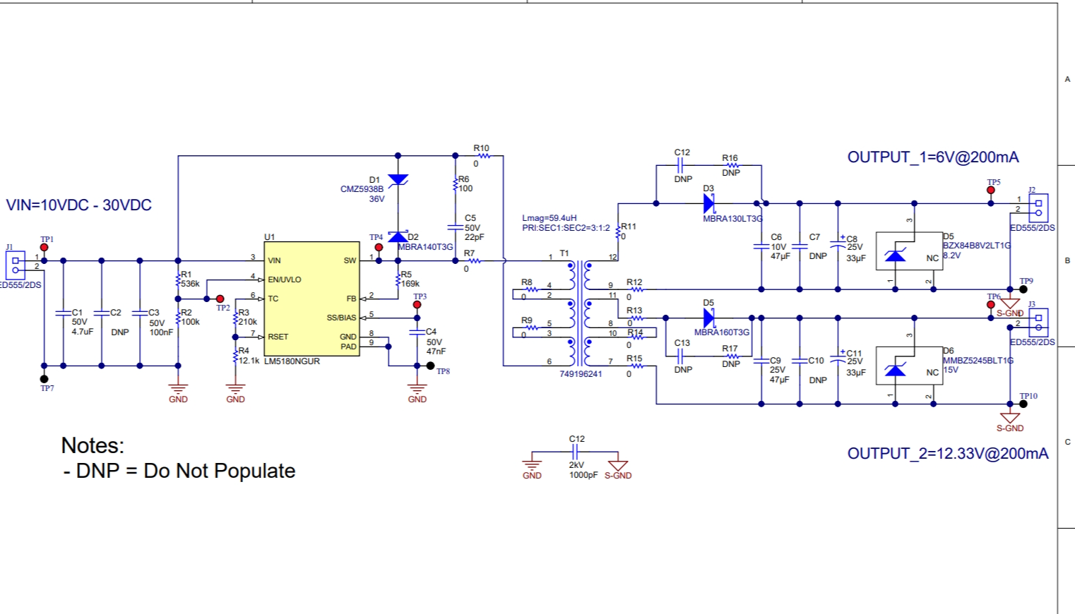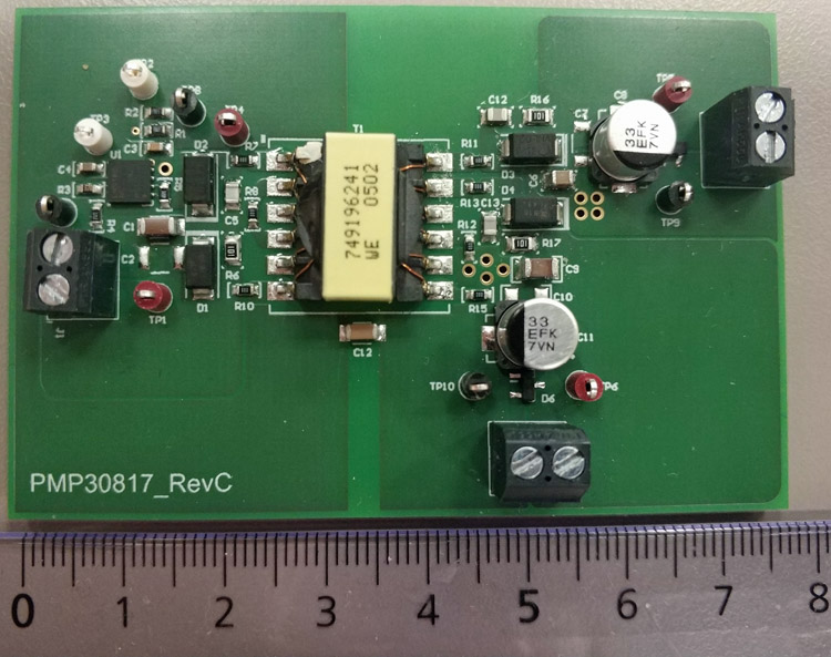 此参考设计通过直流输入电源 (10V - 30V) 提供两个隔离电压(200mA 下,6V 和 12V)。借助零欧姆电阻器,可将灵活变压器配置为更改匝数比和输出电压,而不更改布局。该转换器可实现具有高密度和低组件数的隔离式直流/直流解决方案。不需要辅助变压器绕组,并且集成了一个额定电压为 100V 的初级侧开关。